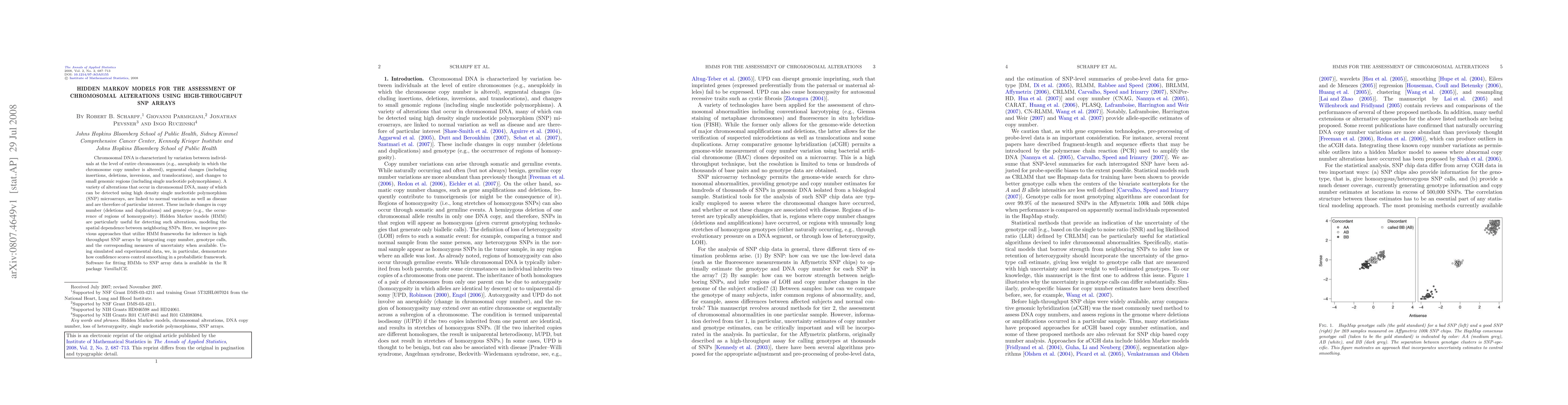 Chromosomal DNA is characterized by variation between individuals at the level of entire chromosomes (e.g., aneuploidy in which the chromosome copy number is altered), segmental changes (including insertions, deletions, inversions, and translocations), and changes to small genomic regions (including single nucleotide polymorphisms). A variety of alterations that occur in chromosomal DNA, many of which can be detected using high density single nucleotide polymorphism (SNP) microarrays, are linked to normal variation as well as disease and are therefore of particular interest. These include changes in copy number (deletions and duplications) and genotype (e.g., the occurrence of regions of homozygosity). Hidden Markov models (HMM) are particularly useful for detecting such alterations, modeling the spatial dependence between neighboring SNPs. Here, we improve previous approaches that utilize HMM frameworks for inference in high throughput SNP arrays by integrating copy number, genotype calls, and the corresponding measures of uncertainty when available. Using simulated and experimental data, we, in particular, demonstrate how confidence scores control smoothing in a probabilistic framework. Software for fitting HMMs to SNP array data is available in the R package VanillaICE.