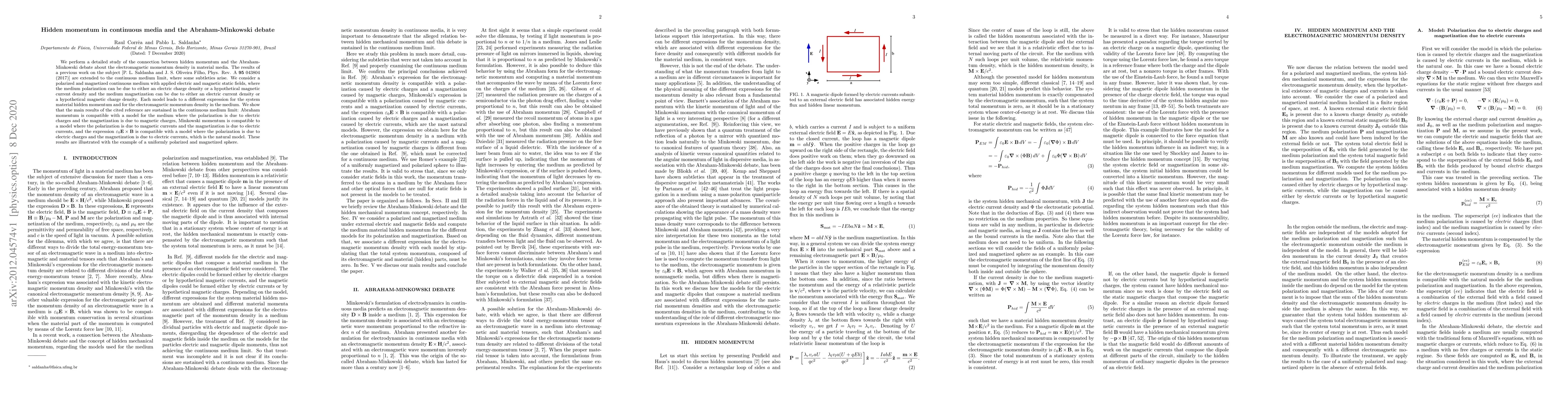 This paper extends the analysis of hidden momentum in continuous media to the debate between Abraham and Minkowski on electromagnetic momentum density. It shows that different models of polarization and magnetization lead to different expressions for hidden momentum and electromagnetic momentum density, supporting the compatibility of Abraham, Minkowski, and $\varepsilon_0\mathbf{E}\times\mathbf{B}$ models under specific conditions.