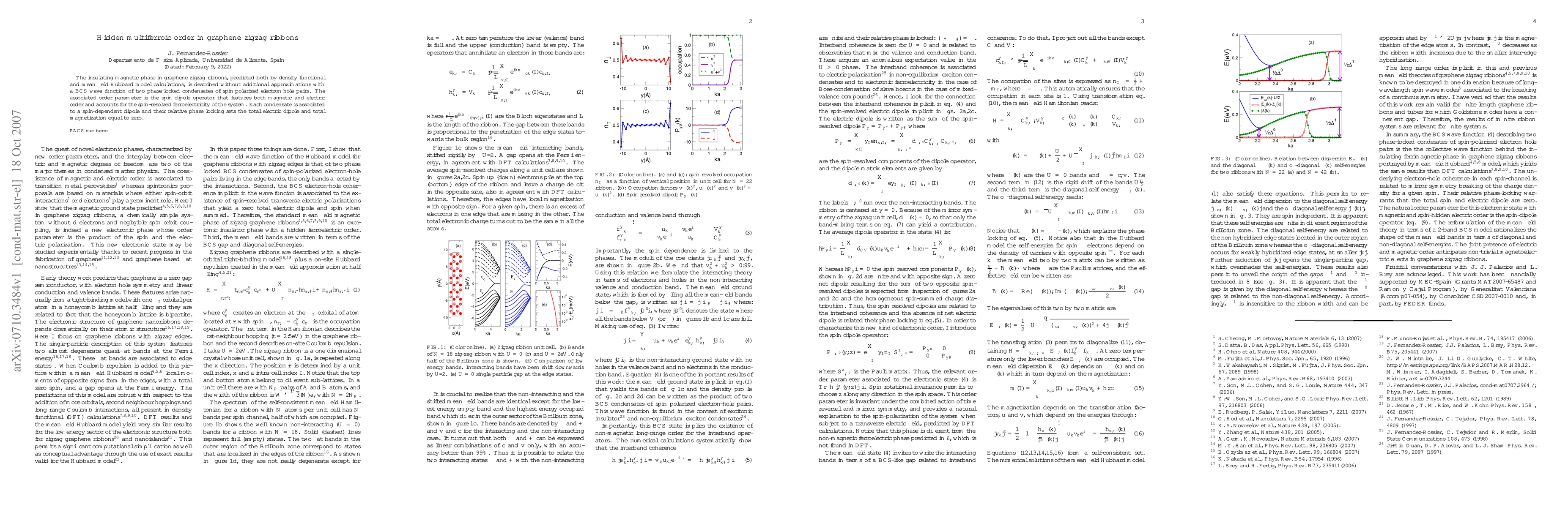 This paper reveals a hidden multiferroic order in graphene zigzag ribbons, characterized by an insulating magnetic phase described by a BCS wave function of two phase-locked spin-polarized electron-hole pair condensates. The spin dipole operator, featuring both magnetic and electric order, explains the spin-resolved ferroelectricity, with the relative phase locking ensuring zero total electric dipole and magnetization.