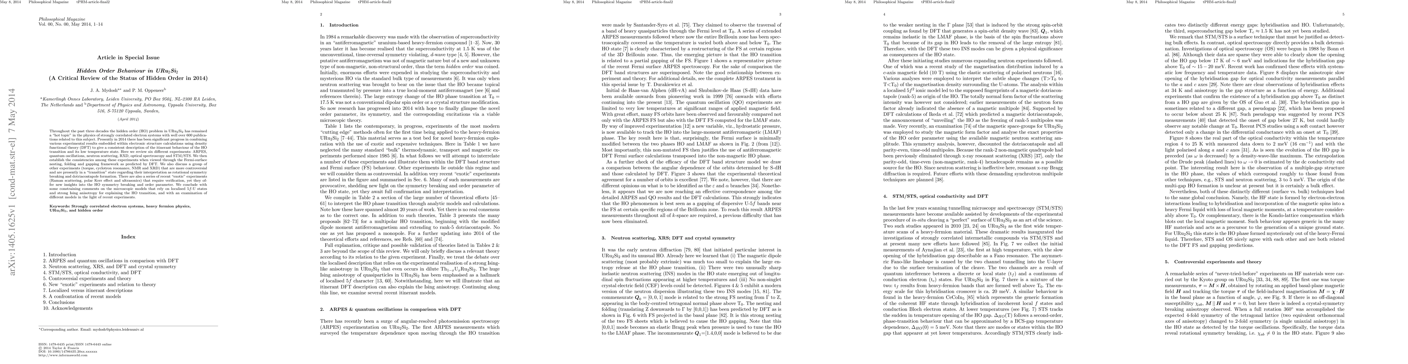 Throughout the past three decades the hidden order (HO) problem in URu$_2$Si$_2$ has remained a "hot topic" in the physics of strongly correlated electron systems with well over 600 publications related to this subject. Presently in 2014 there has been significant progress in combining various experimental results embedded within electronic structure calculations using density functional theory (DFT) to give a consistent description of the itinerant behaviour of the HO transition and its low temperature state. Here we review six different experiments: ARPES, quantum oscillations, neutron scattering, RXD, optical spectroscopy and STM/STS. We then establish the consistencies among these experiments when viewed through the Fermi-surface nesting, folding and gapping framework as predicted by DFT. We also discuss a group of other experiments (torque, cyclotron resonance, NMR and XRD) that are more controversial and are presently in a "transition" state regarding their interpretation as rotational symmetry breaking and dotriacontapole formation. There are also a series of recent "exotic" experiments (Raman scattering, polar Kerr effect and ultrasonics) that require verification, yet they offer new insights into the HO symmetry breaking and order parameter. We conclude with some constraining comments on the microscopic models that rely on localised $5f$-U states and strong Ising anisotropy {for explaining} the HO transition, and with an examination of different models in the light of recent experiments.
