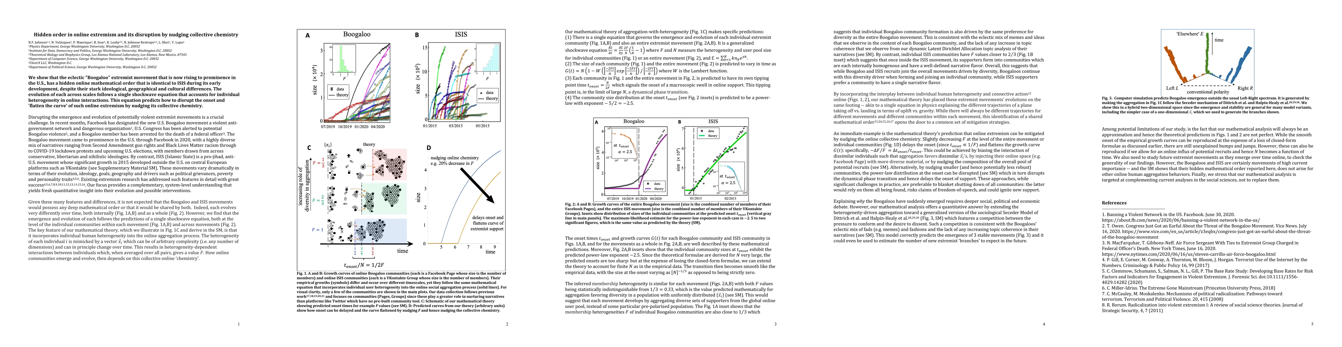 We show that the eclectic "Boogaloo" extremist movement that is now rising to prominence in the U.S., has a hidden online mathematical order that is identical to ISIS during its early development, despite their stark ideological, geographical and cultural differences. The evolution of each across scales follows a single shockwave equation that accounts for individual heterogeneity in online interactions. This equation predicts how to disrupt the onset and 'flatten the curve' of such online extremism by nudging its collective chemistry.
