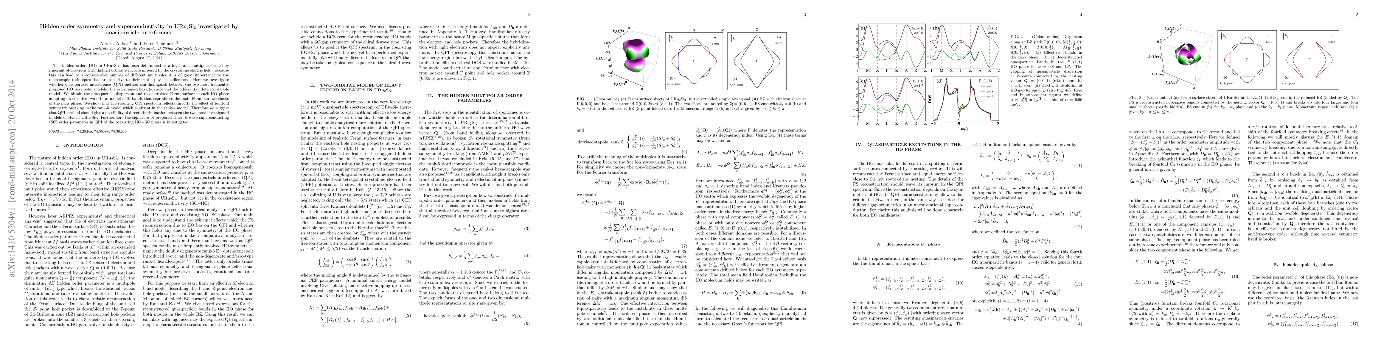 The hidden order (HO) in URu2Si2 has been determined as a high rank multipole formed by itinerant 5f-electrons with distinct orbital structure imposed by the crystalline electric field. Because this can lead to a considerable number of different multipoles it is of great importance to use microscopic techniques that are sensitive to their subtle physical differences. Here we investigate whether quasiparticle interference (QPI) method can distinguish between the two most frequently proposed HO parameter models: the even rank-4 hexadecapole and the odd-rank-5 dotriacontapole model. We obtain the quasiparticle dispersion and reconstructed Fermi surface in each HO phase adapting an effective two-orbital model of 5f bands that reproduces the main Fermi surface sheets of the para phase. We show that the resulting QPI spectrum reflects directly the effect of fourfold symmetry breaking in the rank-5 model which is absent in the rank-4 model. Therefore we suggest that QPI method should give a possibility of direct discrimination between the two most investigated models of HO in URu2Si2. Furthermore the signature of proposed chiral d-wave superconducting (SC) order parameter in QPI of the coexisting HO+SC phase is investigated.