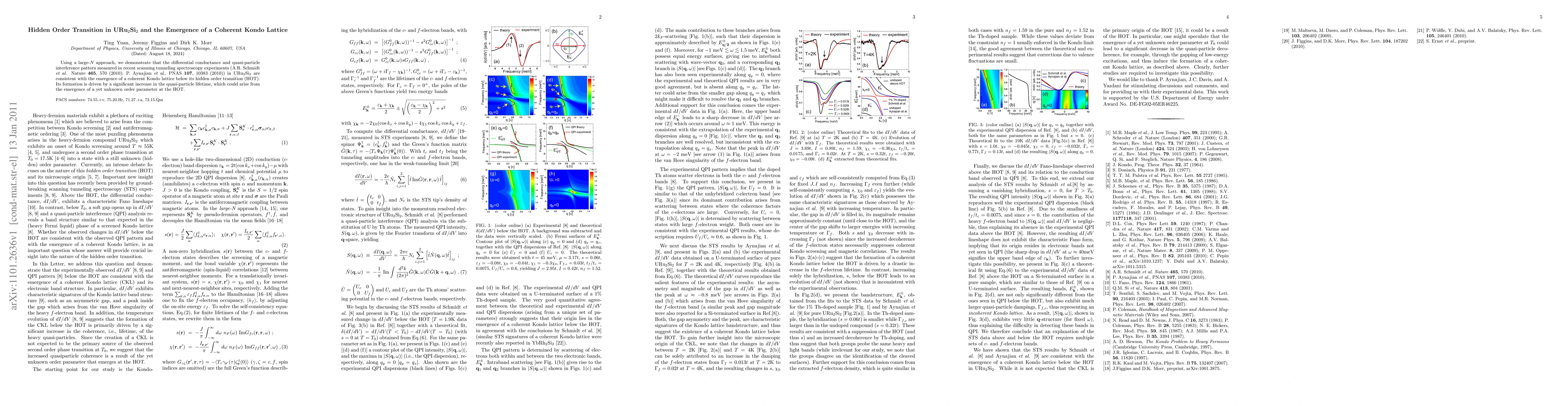 This work distinguishes itself by combining large-N theory with recent STS and QPI experimental data to propose the formation of a coherent Kondo lattice in URu2Si2, offering a new perspective on the hidden order transition in this material.
