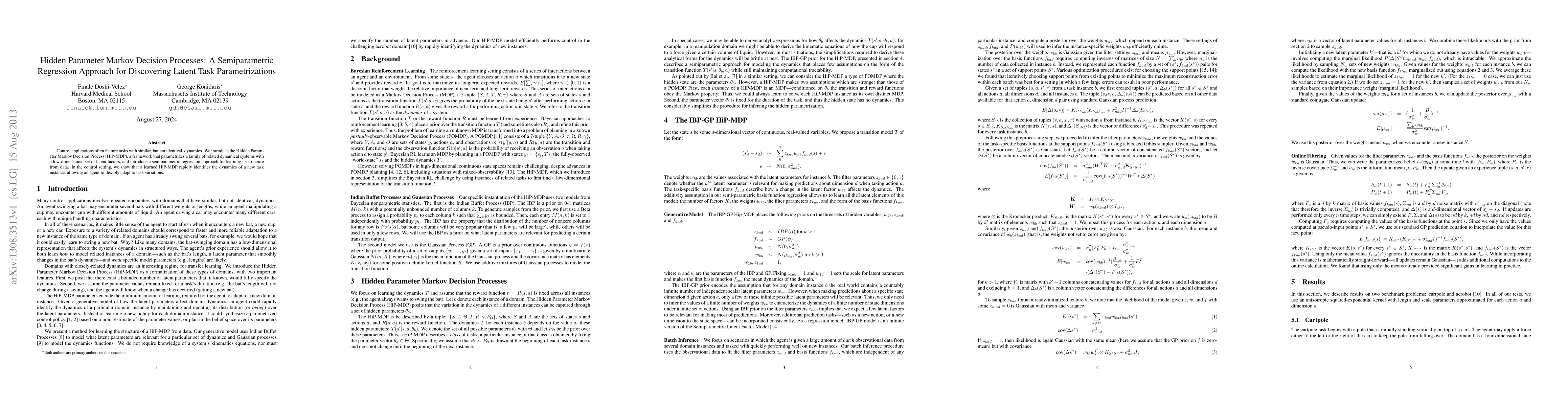 Summary: The paper introduces Hidden Parameter Markov Decision Processes (HiP-MDP) to parametrize related dynamical systems using latent factors, employing a semiparametric regression approach for structure learning from data. This framework enables agents to quickly adapt to new task variations in control applications.