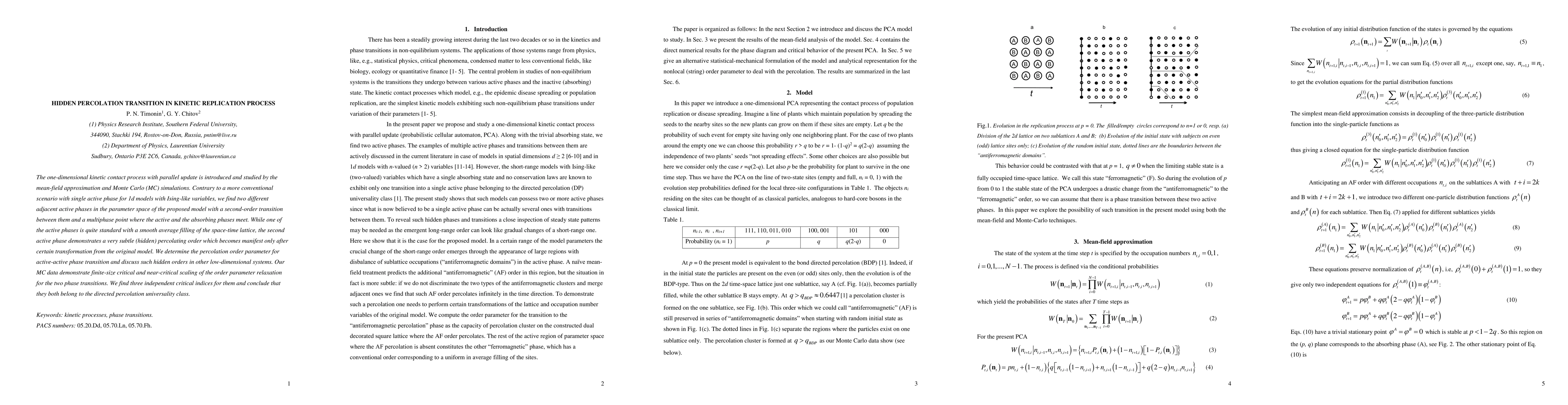 Researchers discovered a hidden percolation transition in a kinetic contact process model with two adjacent active phases, which exhibit subtle yet manifest percolating orders. The study found three independent critical indices, indicating that both transitions belong to the directed percolation universality class.