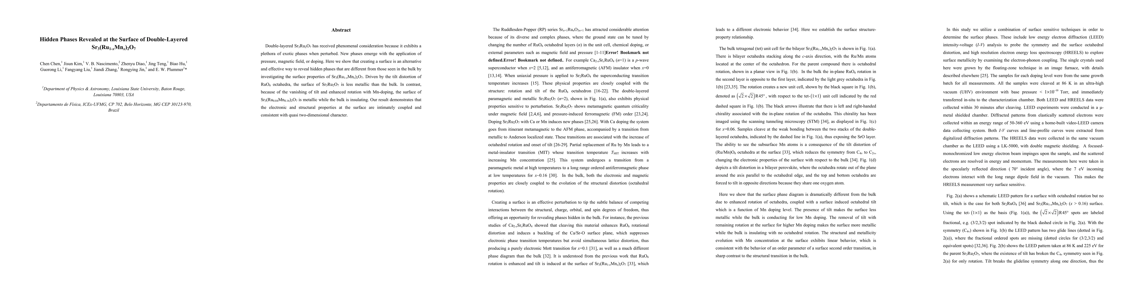 This paper reveals that the surface of double-layered Sr3(Ru1-xMnx)2O7 exhibits hidden phases distinct from the bulk, driven by surface tilt distortions and Mn-doping effects, showcasing the intricate coupling between electronic and structural properties.