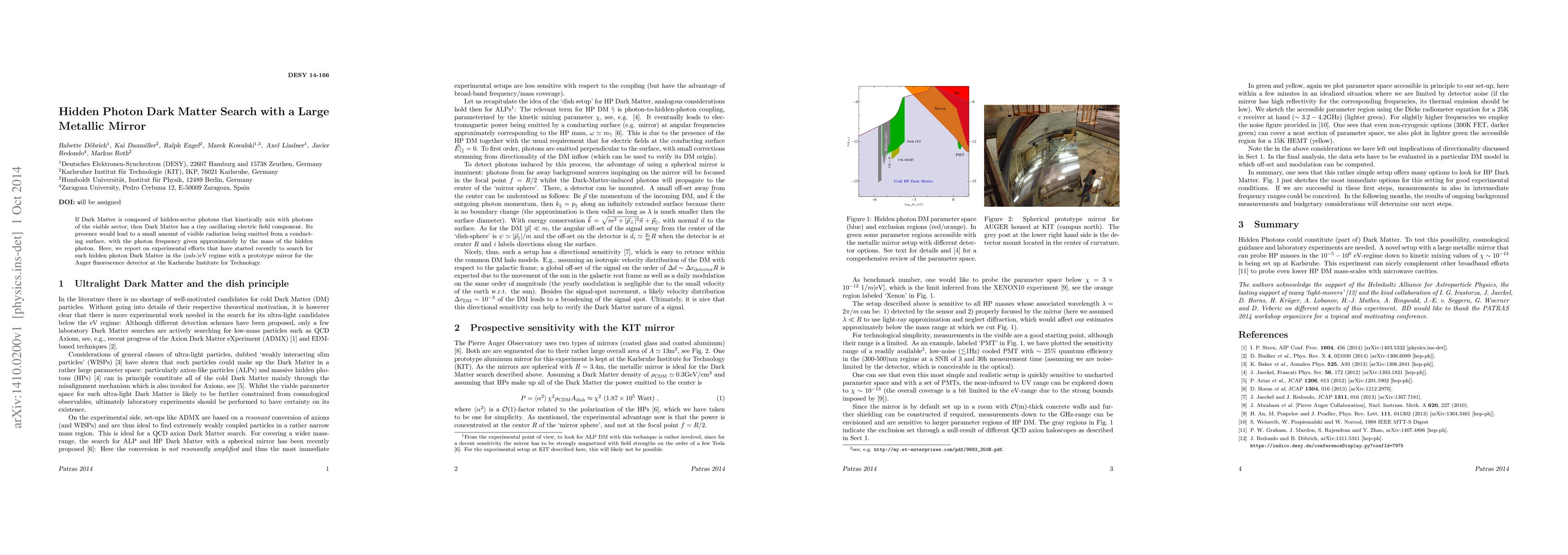 This paper discusses experimental efforts to detect hidden photon Dark Matter through kinetic mixing with visible photons, utilizing a large metallic mirror to observe emitted radiation in the (sub-)eV regime, with initial results reported using a prototype mirror at the Karlsruhe Institute for Technology.