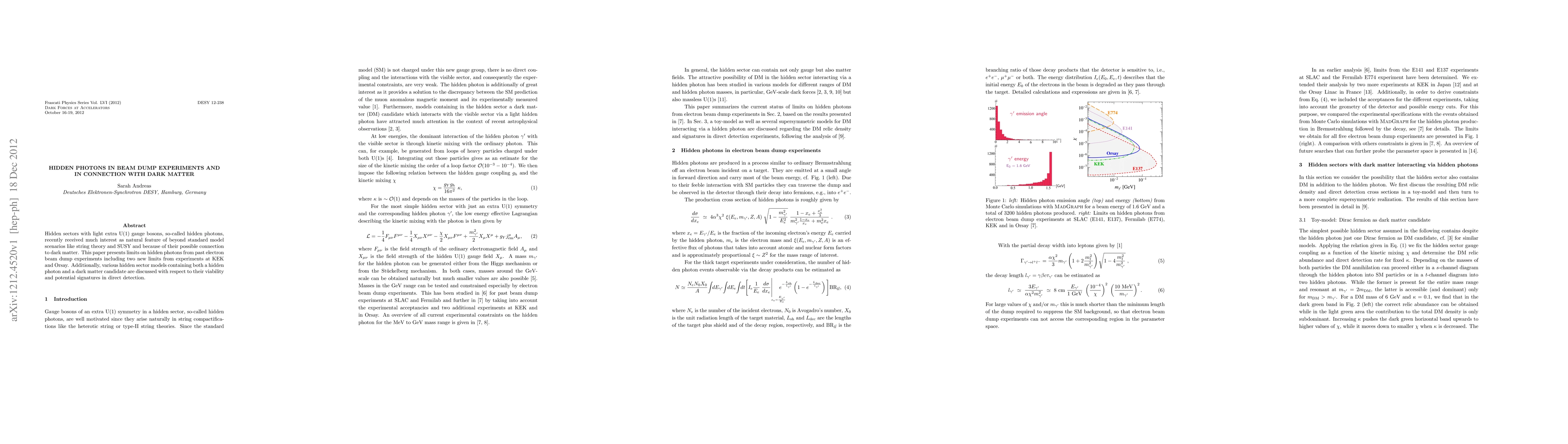 Hidden sectors with light extra U(1) gauge bosons, so-called hidden photons, recently received much interest as natural feature of beyond standard model scenarios like string theory and SUSY and because of their possible connection to dark matter. This paper presents limits on hidden photons from past electron beam dump experiments including two new limits from experiments at KEK and Orsay. Additionally, various hidden sector models containing both a hidden photon and a dark matter candidate are discussed with respect to their viability and potential signatures in direct detection.