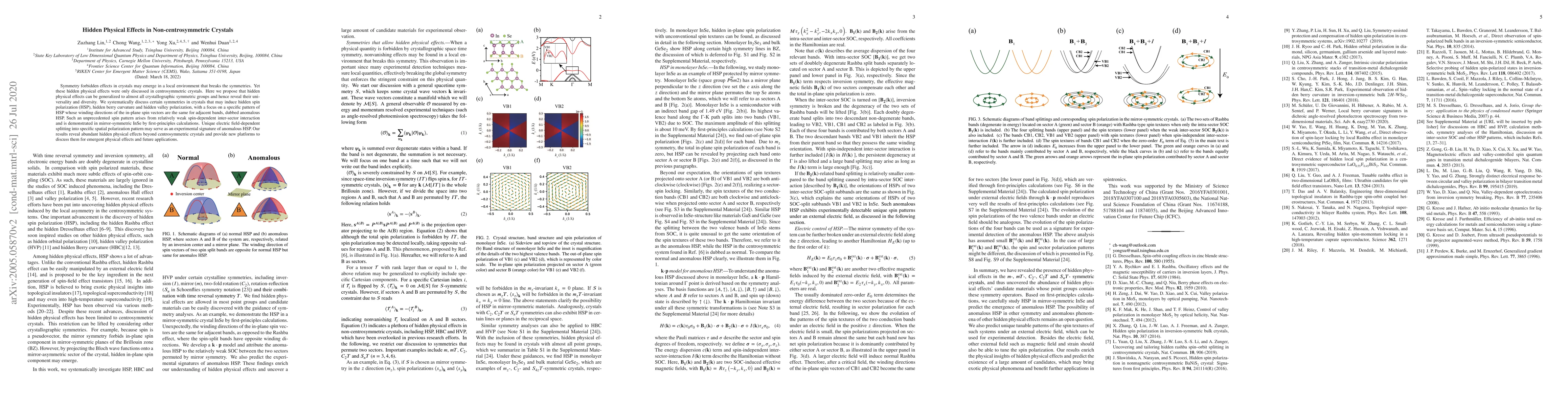 Symmetry forbidden effects in crystals may emerge in a local environment that breaks the symmetries. Yet these hidden physical effects were only discussed in centrosymmetric crystals. Here we propose that hidden physical effects can be generalized to almost all crystallographic symmetric groups and hence reveal their universality and diversity. We systematically discuss certain symmetries in crystals that may induce hidden spin polarization (HSP), hidden berry curvature and hidden valley polarization, with a focus on a specific pattern of HSP whose winding directions of the in-plane spin vectors are the same for adjacent bands, dubbed anomalous HSP. Such an unprecedented spin pattern arises from relatively weak spin-dependent inter-sector interaction and is demonstrated in mirror-symmetric InSe by first-principles calculations. Unique electric field-dependent splitting into specific spatial polarization pattern may serve as an experimental signature of anomalous HSP. Our results reveal abundant hidden physical effects beyond centrosymmetric crystals and provide new platforms to discuss them for emergent physical effects and future applications.