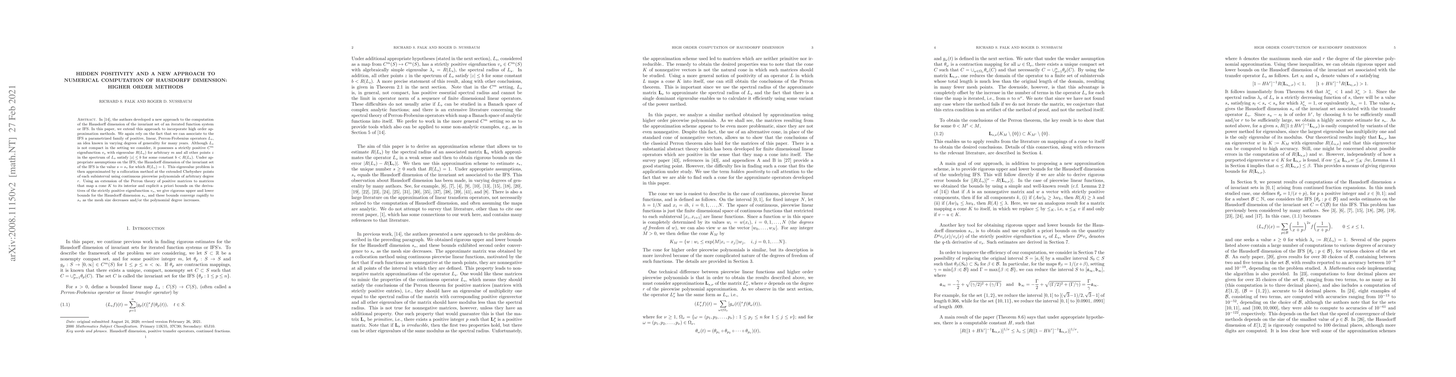 In [14], the authors developed a new approach to the computation of the Hausdorff dimension of the invariant set of an iterated function system or IFS. In this paper, we extend this approach to incorporate high order approximation methods. We again rely on the fact that we can associate to the IFS a parametrized family of positive, linear, Perron-Frobenius operators $L_s$, an idea known in varying degrees of generality for many years. Although $L_s$ is not compact in the setting we consider, it possesses a strictly positive $C^m$ eigenfunction $v_s$ with eigenvalue $R(L_s)$ for arbitrary $m$ and all other points $z$ in the spectrum of $L_s$ satisfy $|z| \le b$ for some constant $b < R(L_s)$. Under appropriate assumptions on the IFS, the Hausdorff dimension of the invariant set of the IFS is the value $s=s_*$ for which $R(L_s) =1$. This eigenvalue problem is then approximated by a collocation method at the extended Chebyshev points of each subinterval using continuous piecewise polynomials of arbitrary degree $r$. Using an extension of the Perron theory of positive matrices to matrices that map a cone $K$ to its interior and explicit a priori bounds on the derivatives of the strictly positive eigenfunction $v_s$, we give rigorous upper and lower bounds for the Hausdorff dimension $s_*$, and these bounds converge rapidly to $s_*$ as the mesh size decreases and/or the polynomial degree increases.