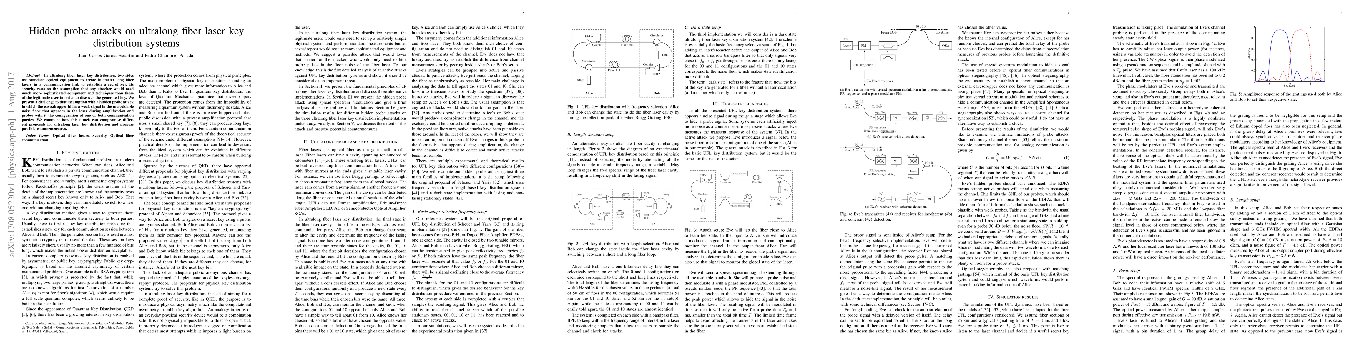 In ultralong fiber laser key distribution, two sides use standard optical equipment to create kilometer long fiber lasers in a communication link to establish a secret key. Its security rests on the assumption that any attacker would need much more sophisticated equipment and techniques than those of the legitimate user in order to discover the generated key. We present a challenge to that assumption with a hidden probe attack in which the eavesdropper hides a weak signal in the unavoidable noise floor that appears in the laser during amplification and probes with it the configuration of one or both communication parties. We comment how this attack can compromise different proposals for ultralong laser key distribution and propose possible countermeasures.