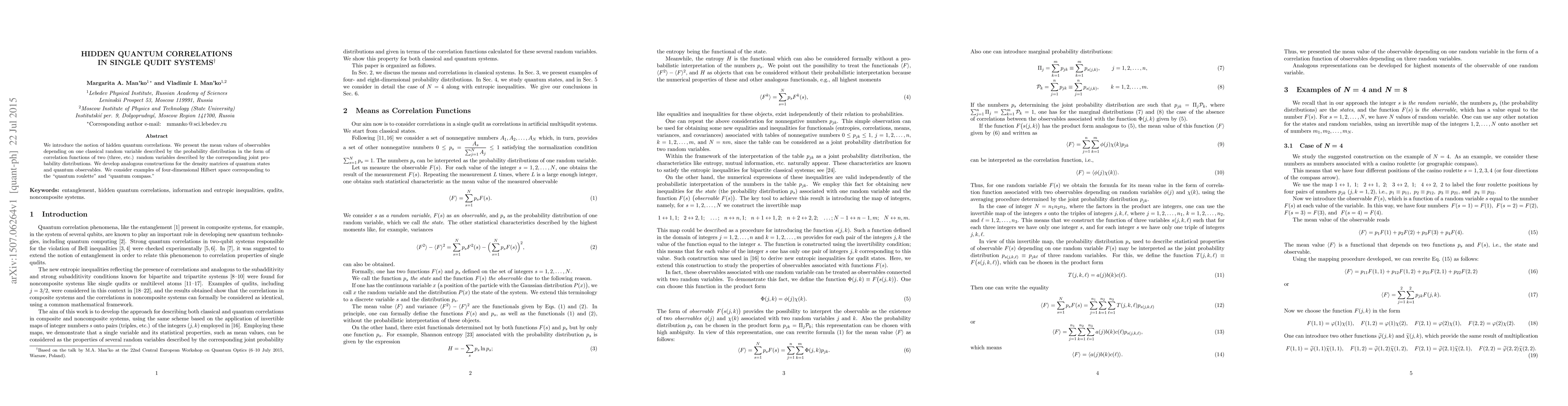 We introduce the notion of hidden quantum correlations. We present the mean values of observables depending on one classical random variable described by the probability distribution in the form of correlation functions of two (three, etc.) random variables described by the corresponding joint probability distributions. We develop analogous constructions for the density matrices of quantum states and quantum observables. We consider examples of four-dimensional Hilbert space corresponding to the "quantum roulette" and "quantum compass."