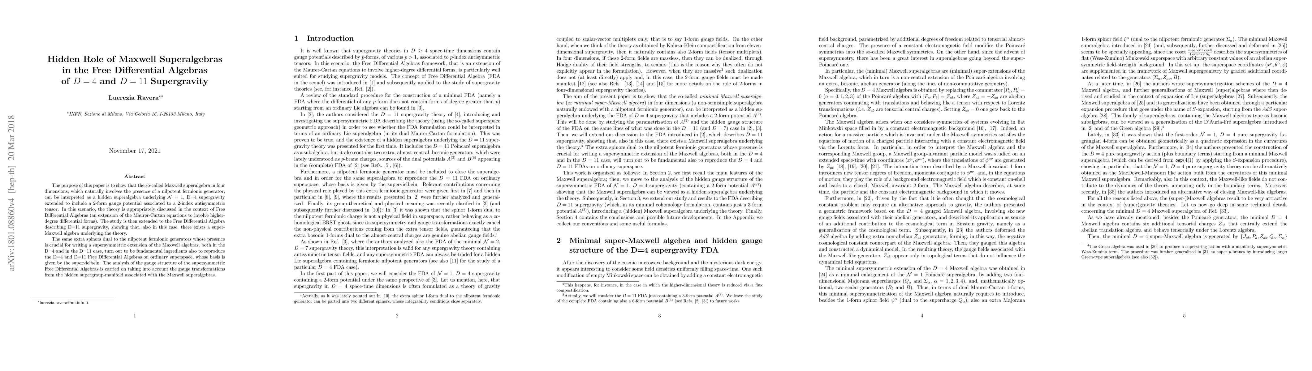 This paper reveals the hidden Maxwell superalgebra underlying N=1 D=4 supergravity and extends its findings to D=11 supergravity, demonstrating that these superalgebras are integral to the Free Differential Algebras describing both theories, with crucial roles played by extra spinors.