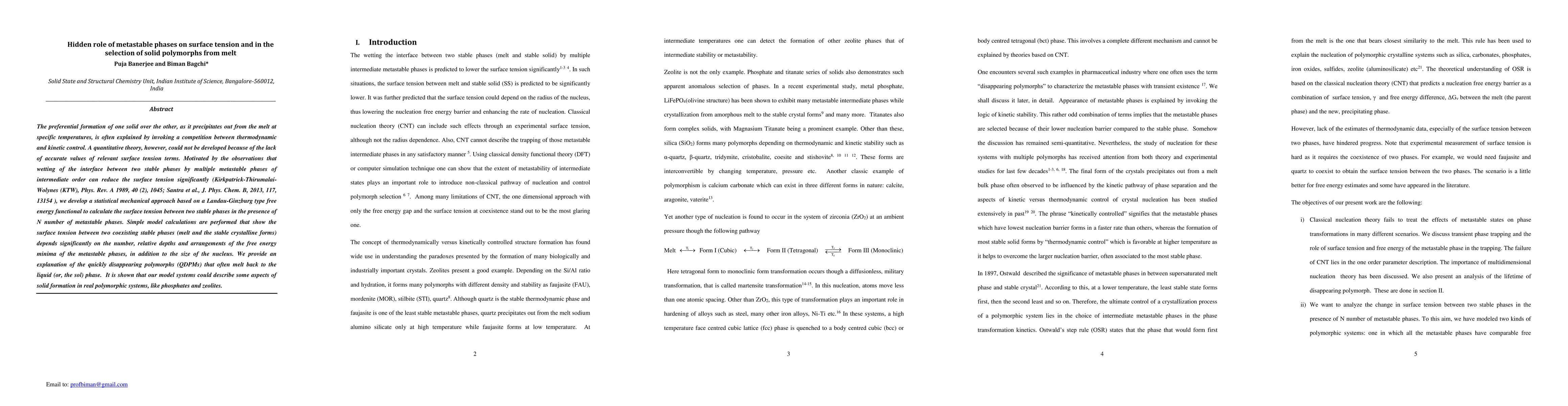 The preferential formation of one solid over the other, as it precipitates out from the melt at specific temperatures, is often explained by invoking a competition between thermodynamic and kinetic control. A quantitative theory, however, could not be developed because of the lack of accurate values of relevant surface tension terms. Motivated by the observations that wetting of the interface between two stable phases by multiple metastable phases of intermediate order can reduce the surface tension significantly (Kirkpatrick-Thirumalai-Wolynes (KTW), Phys. Rev. A 1989, 40 (2), 1045; Santra et al., J. Phys. Chem. B, 2013, 117, 13154 ), we develop a statistical mechanical approach based on a Landau-Ginzburg type free energy functional to calculate the surface tension between two stable phases in the presence of N number of metastable phases. Simple model calculations are performed that show the surface tension between two coexisting stable phases (melt and the stable crystalline forms) depends significantly on the number, relative depths and arrangements of the free energy minima of the metastable phases, in addition to the size of the nucleus. We provide an explanation of the quickly disappearing polymorphs (QDPMs) that often melt back to the liquid (or, the sol) phase. It is shown that our model systems could describe some aspects of solid formation in real polymorphic systems, like phosphates and zeolites.