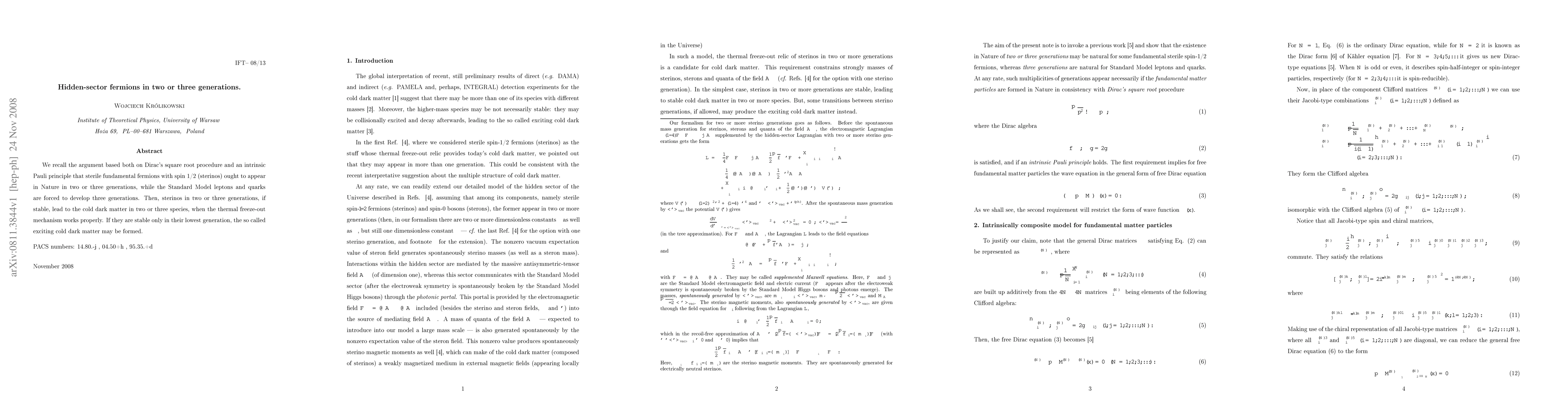 We recall the argument based both on Dirac's square root procedure and an intrinsic Pauli principle that sterile fundamental fermions with spin 1/2 (sterinos) ought to appear in Nature in two or three generations, while the Standard Model leptons and quarks are forced to develop three generations. Then, sterinos in two or three generations, if stable, lead to the cold dark matter in two or three species, when the thermal freeze-out mechanism works properly. If they are stable only in their lowest generation, the so called exciting cold dark matter may be formed.