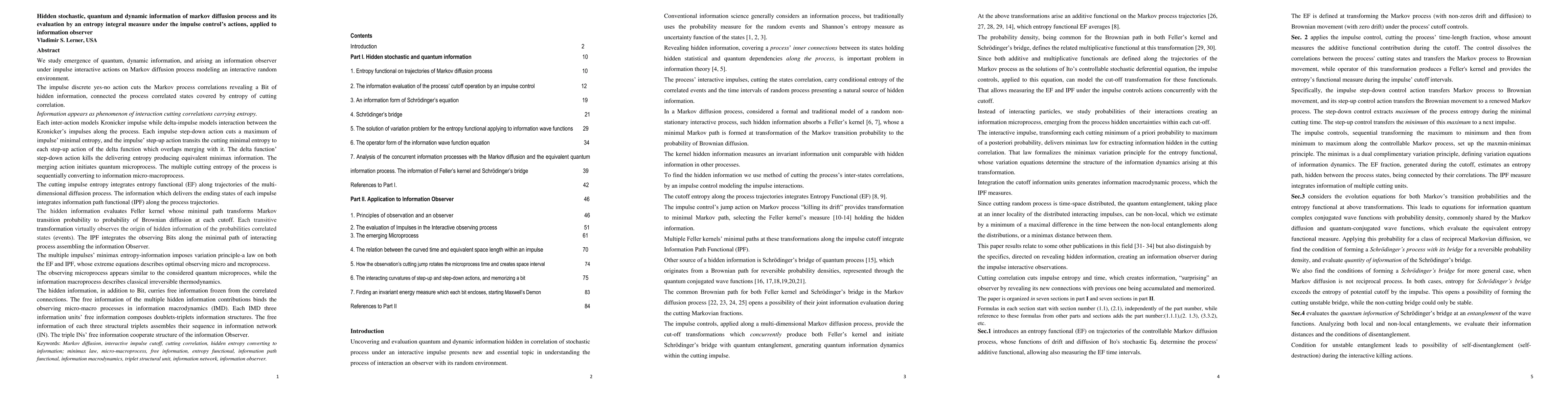 Hidden information emerges under impulse interactions with Markov diffusion process modeling interactive random environment. Impulse yes no action cuts Markov correlations revealing Bit of hidden information connected correlated states. Information appears phenomenon of interaction cutting correlations carrying entropy. Each inter action models Kronicker impulse, delta impulse models interaction between the Kronicker impulses. Each impulse step down action cuts maximum of impulse minimal entropy and impulse step up action transits cutting minimal entropy to each step up action of merging delta function. Delta step down action kills delivering entropy producing equivalent minimax information. The merging action initiates quantum microprocess. Multiple cutting entropy is converting to information micro macroprocess. Cutting impulse entropy integrates entropy functional EF along trajectories of multidimensional diffusion process. Information which delivers ending states of each impulse integrates information path functional IPF along process trajectories. Hidden information evaluates Feller kernel whose minimal path transforms Markov transition probability to probability of Brownian diffusion. Each transitive transformation virtually observes origin of hidden information probabilities correlated states. IPF integrates observing Bits along minimal path assembling information Observer. Minimax imposes variation principle on EF and IPF whose extreme equations describe observing micro and macroprocess which describes irreversible thermodynamics. Hidden information curries free information frozen from correlated connections. Free information binds observing micro macro processes in information macrodynamics. Each dynamic three free information composes triplet structures. Three structural triplets assemble information network. Triple networks free information cooperate information Observer.
