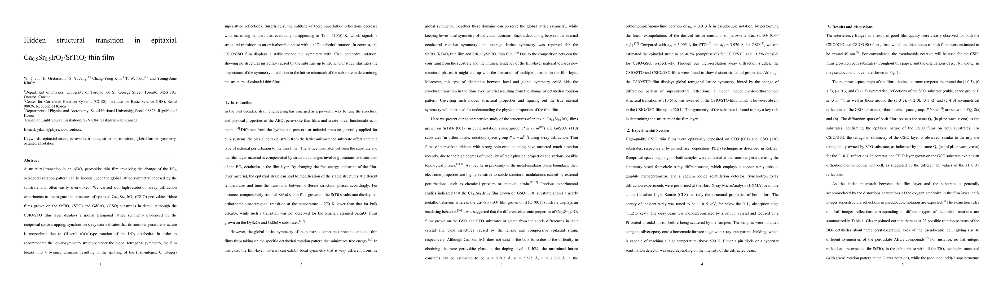 This study reveals a hidden structural transition in epitaxial Ca$_{0.5}$Sr$_{0.5}$IrO$_{3}$ thin films grown on SrTiO$_{3}$, where a monoclinic structure is masked by the tetragonal global symmetry. The film undergoes a transition to an orthorhombic phase at 510(5) K. In contrast, films on GdScO$_{3}$ maintain stable monoclinic symmetry, highlighting the impact of substrate symmetry on thin film structures.