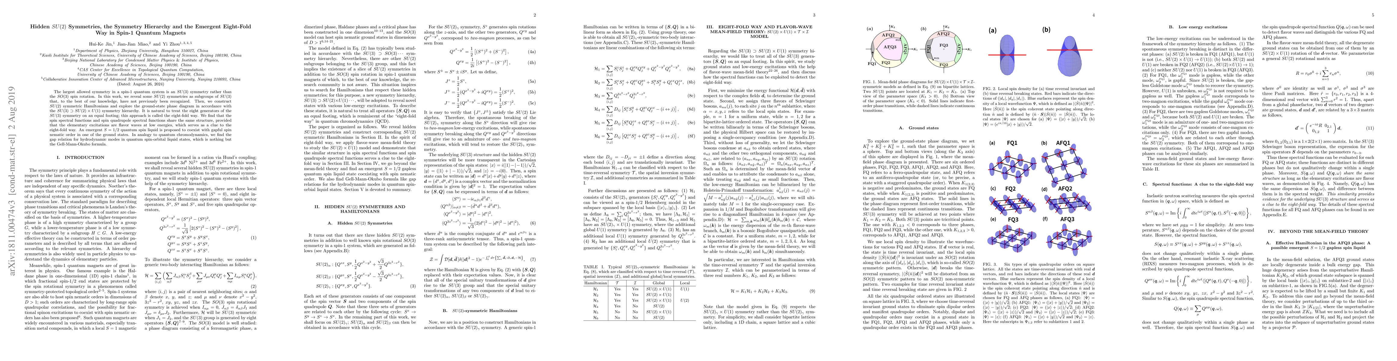 The largest allowed symmetry in a spin-1 quantum system is an $SU(3)$ symmetry rather than the $SO(3)$ spin rotation. In this work, we reveal some $SU(2)$ symmetries as subgroups of $SU(3)$ that, to the best of our knowledge, have not previously been recognized. Then, we construct $SU(2)$ symmetric Hamiltonians and explore the ground-state phase diagram in accordance with the $SU(3)\supset SU(2)\times U(1)$ symmetry hierarchy. It is natural to treat the eight generators of the $SU(3)$ symmetry on an equal footing; this approach is called the eight-fold way. We find that the spin spectral functions and spin quadrupole spectral functions share the same structure, provided that the elementary excitations are flavor waves at low energies, which serves as a clue to the eight-fold way. An emergent $S=1/2$ quantum spin liquid is proposed to coexist with gapful spin nematic order in one of the ground states. In analogy to quantum chromodynamics, we find the gap relation for hydrodynamic modes in quantum spin-orbital liquid states, which is nothing but the Gell-Mann-Okubo formula.