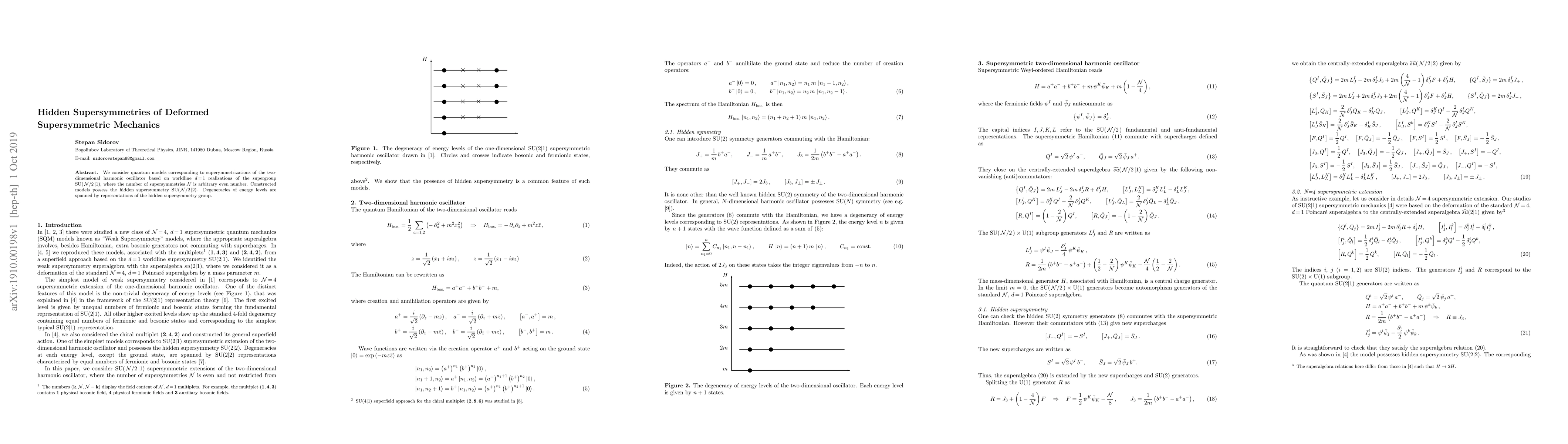 We consider quantum models corresponding to superymmetrizations of the two-dimensional harmonic oscillator based on worldline $d=1$ realizations of the supergroup SU$(\,{\cal N}/2\,|1)$, where the number of supersymmetries ${\cal N}$ is arbitrary even number. Constructed models possess the hidden supersymmetry SU$(\,{\cal N}/2\,|2)$. Degeneracies of energy levels are spanned by representations of the hidden supersymmetry group.