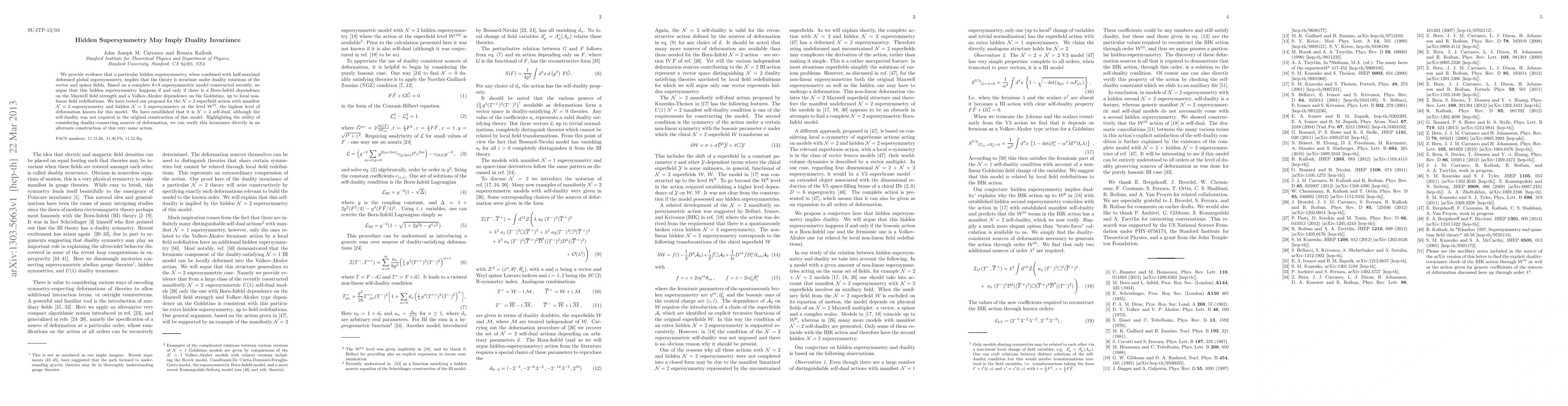 This paper demonstrates that hidden supersymmetry, when paired with half-maximal deformed global supersymmetry, leads to a theory invariant under duality rotations of vector and spinor fields. The authors establish this through a complete 8+8 supersymmetric model, showing that the hidden supersymmetry emerges with specific Born-Infeld and Volkov-Akulov dependencies.