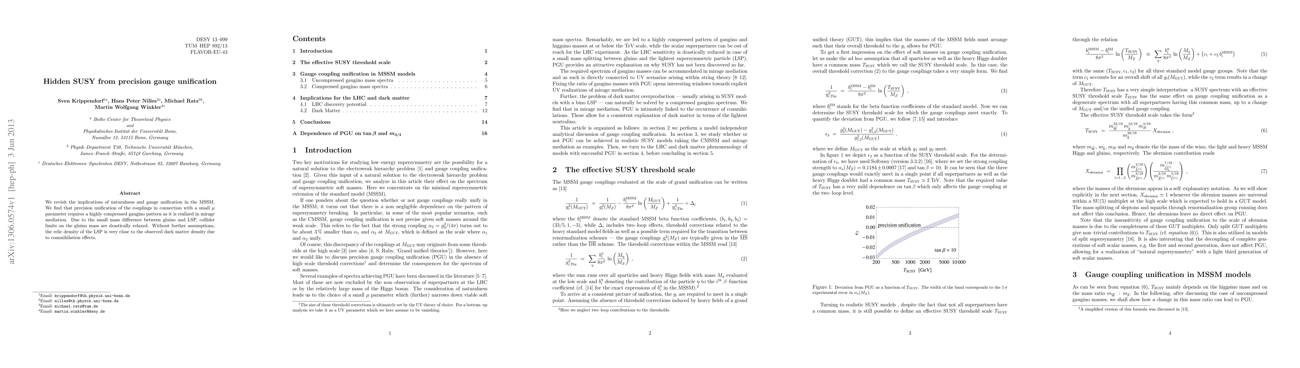 We revisit the implications of naturalness and gauge unification in the MSSM. We find that precision unification of the couplings in connection with a small mu parameter requires a highly compressed gaugino pattern as it is realized in mirage mediation. Due to the small mass difference between gluino and LSP, collider limits on the gluino mass are drastically relaxed. Without further assumptions, the relic density of the LSP is very close to the observed dark matter density due to coannihilation effects.