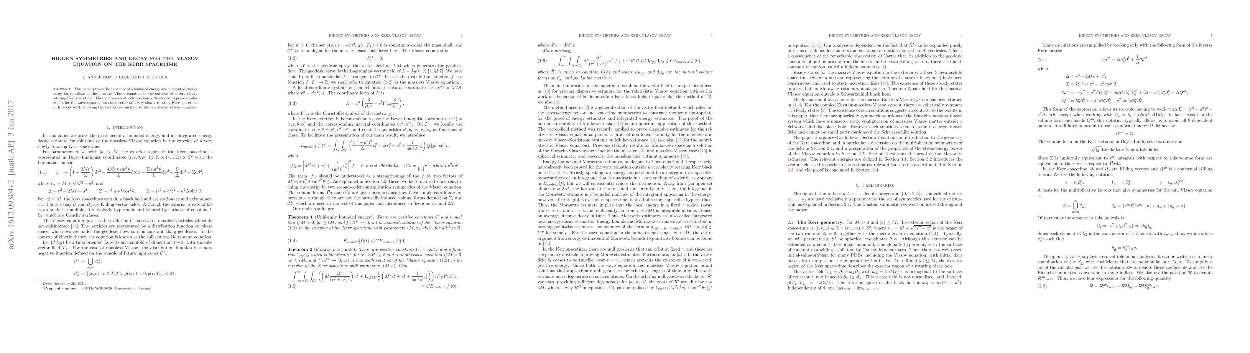 This paper establishes bounded energy and integrated energy decay for solutions of the massless Vlasov equation in the slowly rotating Kerr spacetime, combining techniques from wave equation results and the vector-field method for relativistic Vlasov equations.