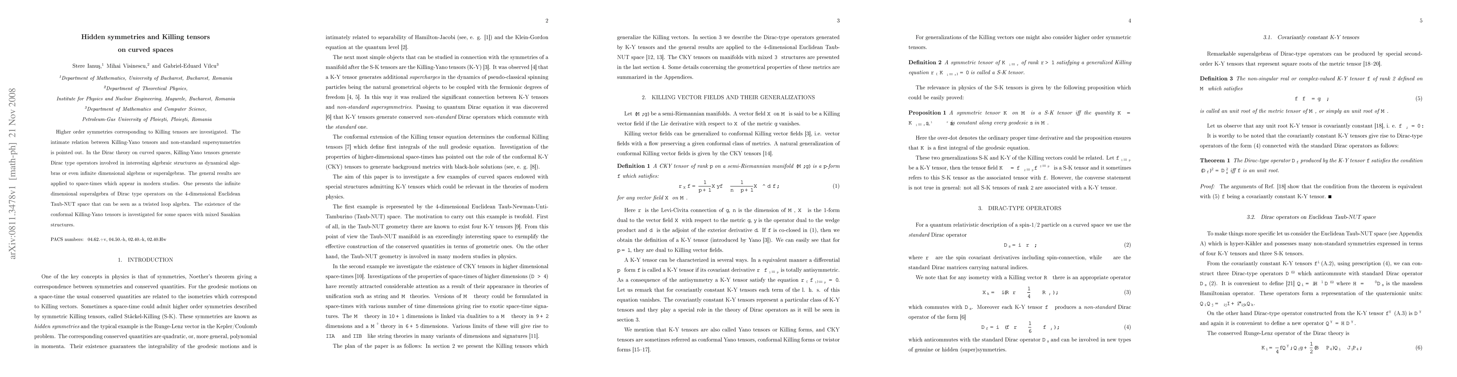 This paper explores higher-order symmetries via Killing tensors and Killing-Yano tensors, highlighting their role in generating Dirac type operators and forming infinite-dimensional superalgebras in curved spaces. Applications include the study of dynamical algebras on the 4-dimensional Euclidean Taub-NUT space and the investigation of conformal Killing-Yano tensors in spaces with mixed Sasakian structures.