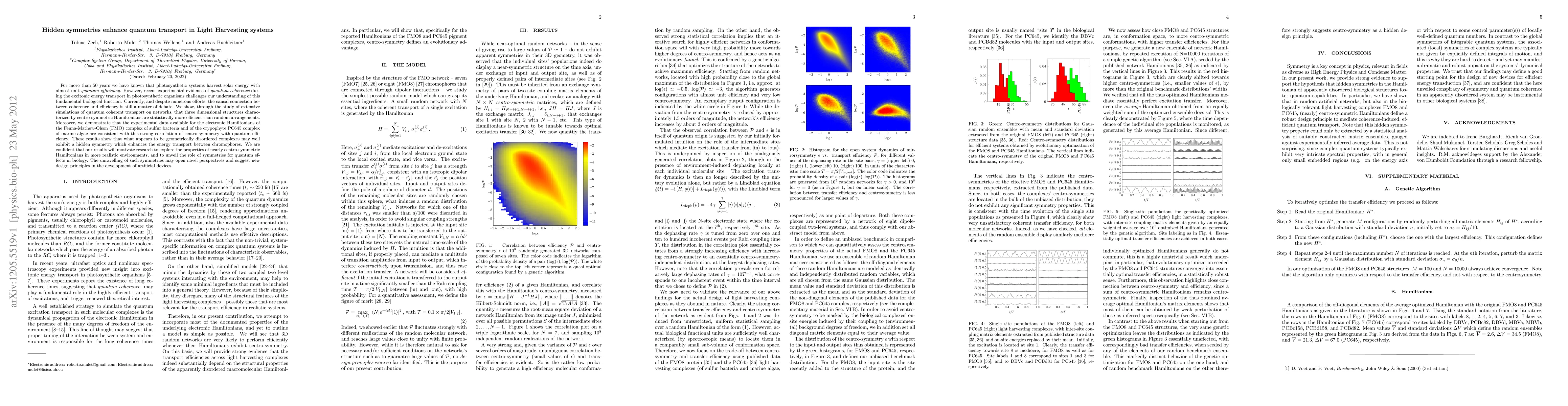 This paper demonstrates that three-dimensional centro-symmetric Hamiltonians enhance quantum transport efficiency in photosynthetic systems, revealing hidden symmetries that improve energy transfer despite apparent disorder. The findings suggest that these symmetries could inspire new designs for artificial quantum devices.