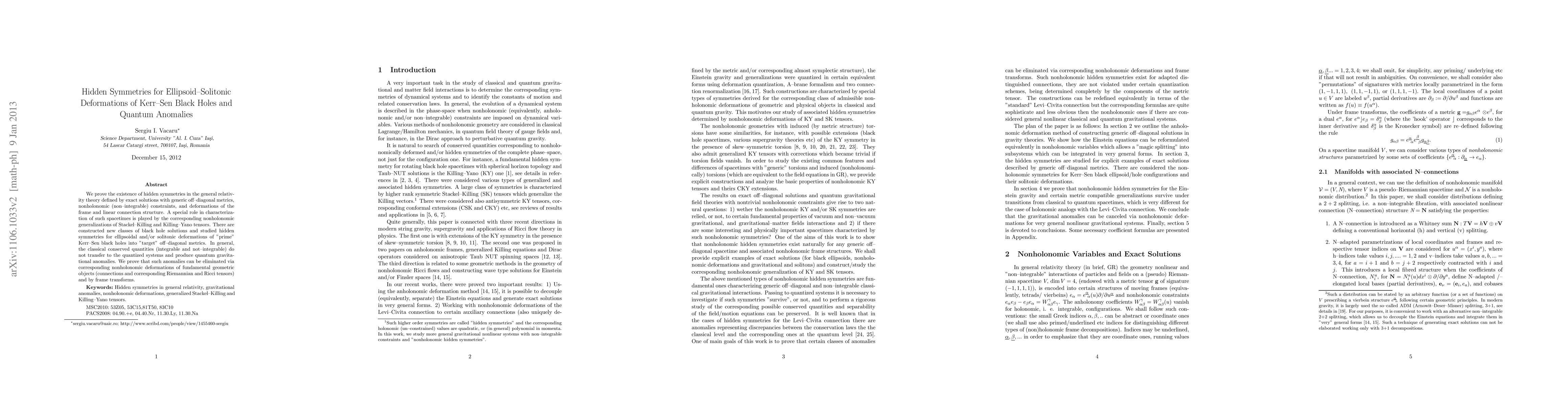 We prove the existence of hidden symmetries in the general relativity theory defined by exact solutions with generic off-diagonal metrics, nonholonomic (non-integrable) constraints, and deformations of the frame and linear connection structure. A special role in characterization of such spacetimes is played by the corresponding nonholonomic generalizations of Stackel-Killing and Killing-Yano tensors. There are constructed new classes of black hole solutions and studied hidden symmetries for ellipsoidal and/or solitonic deformations of "prime" Kerr-Sen black holes into "target" off-diagonal metrics. In general, the classical conserved quantities (integrable and not-integrable) do not transfer to the quantized systems and produce quantum gravitational anomalies. We prove that such anomalies can be eliminated via corresponding nonholonomic deformations of fundamental geometric objects (connections and corresponding Riemannian and Ricci tensors) and by frame transforms.