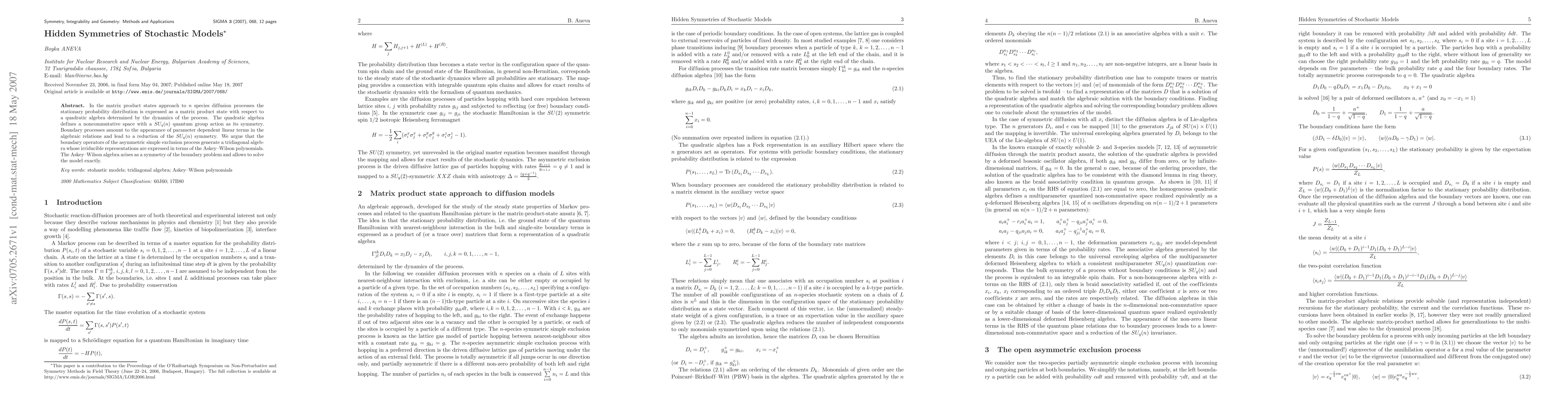 In the matrix product states approach to $n$ species diffusion processes the stationary probability distribution is expressed as a matrix product state with respect to a quadratic algebra determined by the dynamics of the process. The quadratic algebra defines a noncommutative space with a $SU_q(n)$ quantum group action as its symmetry. Boundary processes amount to the appearance of parameter dependent linear terms in the algebraic relations and lead to a reduction of the $SU_q(n)$ symmetry. We argue that the boundary operators of the asymmetric simple exclusion process generate a tridiagonal algebra whose irriducible representations are expressed in terms of the Askey-Wilson polynomials. The Askey-Wilson algebra arises as a symmetry of the boundary problem and allows to solve the model exactly.