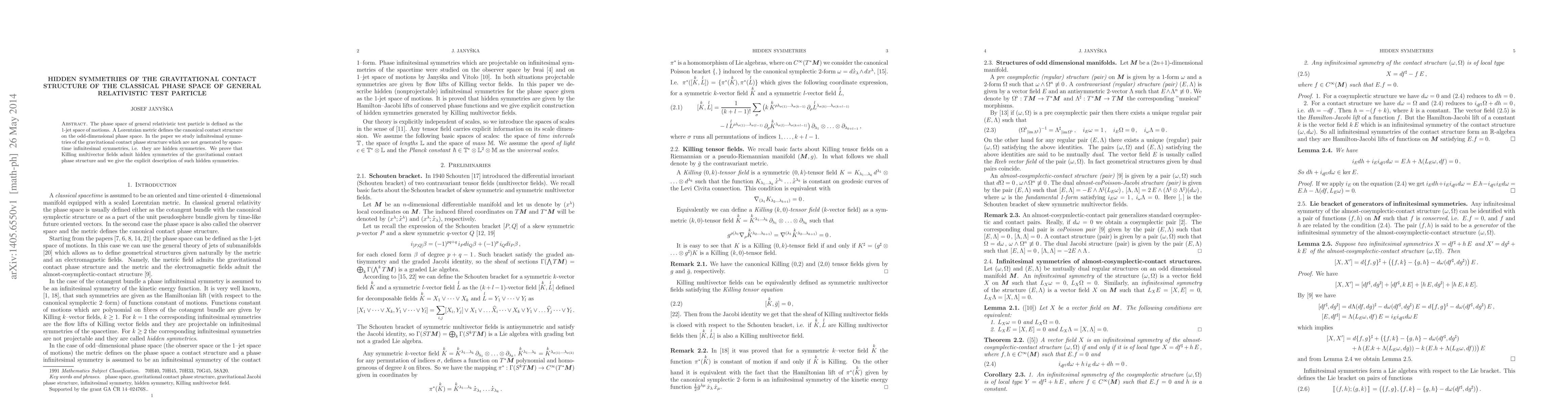The phase space of general relativistic test particle is defined as the 1-jet space of motions. A Lorentzian metric defines the canonical contact structure on the odd-dimensional phase space. In the paper we study infinitesimal symmetries of the gravitational contact phase structure which are not generated by spacetime infinitesimal symmetries, i.e. they are hidden symmetries. We prove that Killing multivector fields admit hidden symmetries of the gravitational contact phase structure and we give the explicit description of such hidden symmetries.