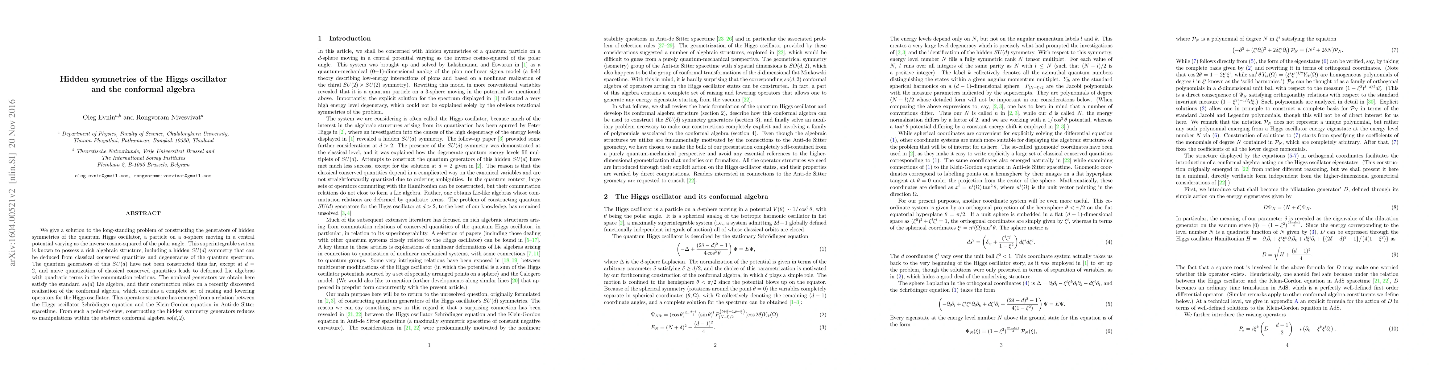 We give a solution to the long-standing problem of constructing the generators of hidden symmetries of the quantum Higgs oscillator, a particle on a d-sphere moving in a central potential varying as the inverse cosine-squared of the polar angle. This superintegrable system is known to possess a rich algebraic structure, including a hidden SU(d) symmetry that can be deduced from classical conserved quantities and degeneracies of the quantum spectrum. The quantum generators of this SU(d) have not been constructed thus far, except at d=2, and naive quantization of classical conserved quantities leads to deformed Lie algebras with quadratic terms in the commutation relations. The nonlocal generators we obtain here satisfy the standard su(d) Lie algebra, and their construction relies on a recently discovered realization of the conformal algebra, which contains a complete set of raising and lowering operators for the Higgs oscillator. This operator structure has emerged from a relation between the Higgs oscillator Schroedinger equation and the Klein-Gordon equation in Anti-de Sitter spacetime. From such a point-of-view, the construction of the hidden symmetry generators reduces to manipulations within the abstract conformal algebra so(d,2).