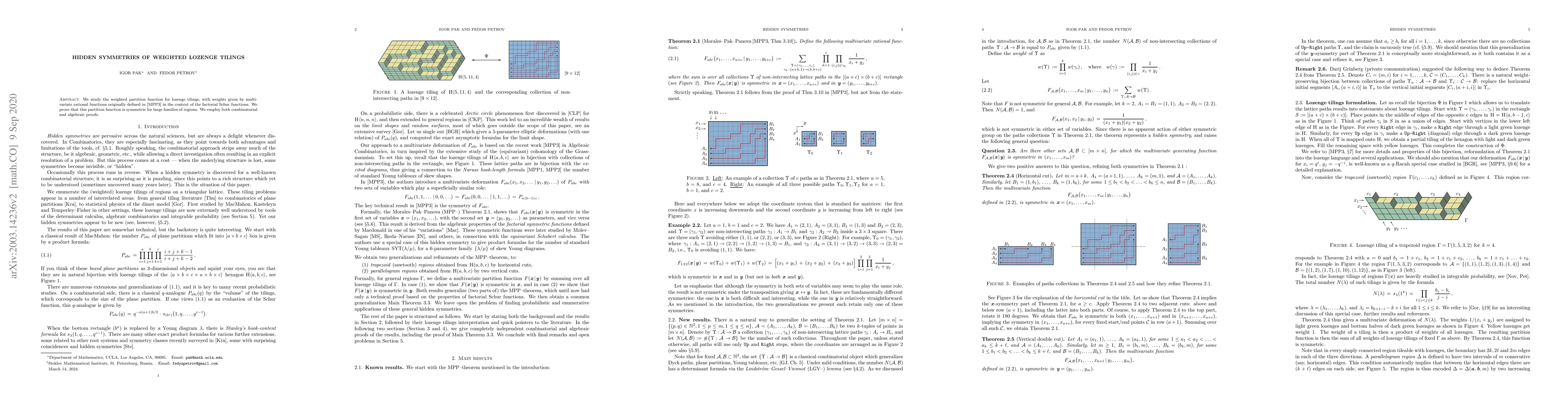 Researchers studied weighted lozenge tilings and found that their partition function exhibits symmetry for large regions, employing both combinatorial and algebraic approaches.