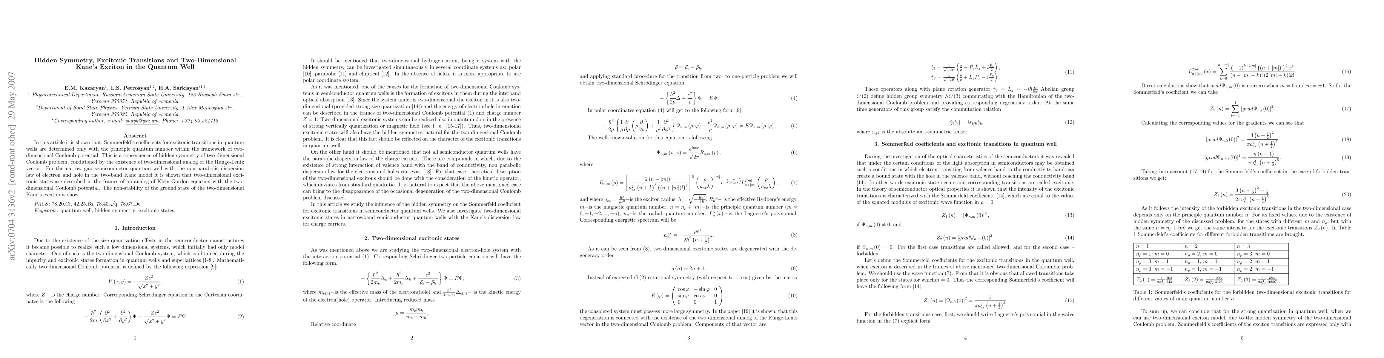 In this article it is shown that, Sommerfeld's coefficients for excitonic transitions in quantum wells are determined only with the principle quantum number within the framework of two-dimensional Coulomb potential. This is a consequence of hidden symmetry of two-dimensional Coulomb problem, conditioned by the existence of two-dimensional analog of the Runge-Lentz vector. For the narrow gap semiconductor quantum well with the non-parabolic dispersion law of electron and hole in the two-band Kane model it is shown that two-dimensional excitonic states are described in the frames of an analog of Klein-Gordon equation with the two-dimensional Coulomb potential. The non-stability of the ground state of the two-dimensional Kane's exciton is show.