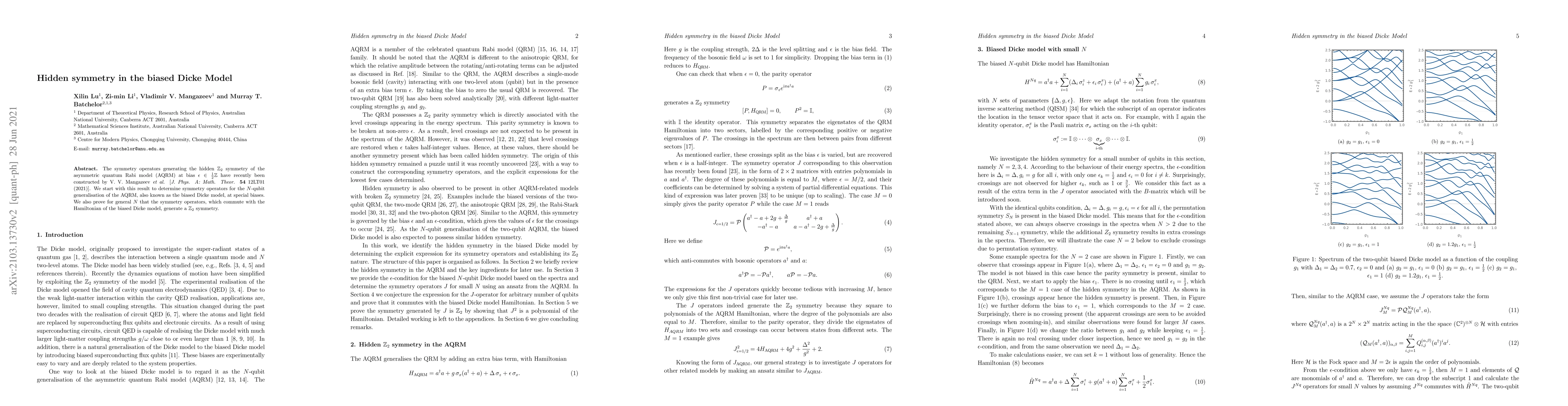 The symmetry operators generating the hidden $\mathbb{Z}_2$ symmetry of the asymmetric quantum Rabi model (AQRM) at bias $\epsilon \in \frac{1}{2}\mathbb{Z}$ have recently been constructed by V. V. Mangazeev et al. [J. Phys. A: Math. Theor. 54 12LT01 (2021)]. We start with this result to determine symmetry operators for the $N$-qubit generalisation of the AQRM, also known as the biased Dicke model, at special biases. We also prove for general $N$ that the symmetry operators, which commute with the Hamiltonian of the biased Dicke model, generate a $\mathbb{Z}_2$ symmetry.