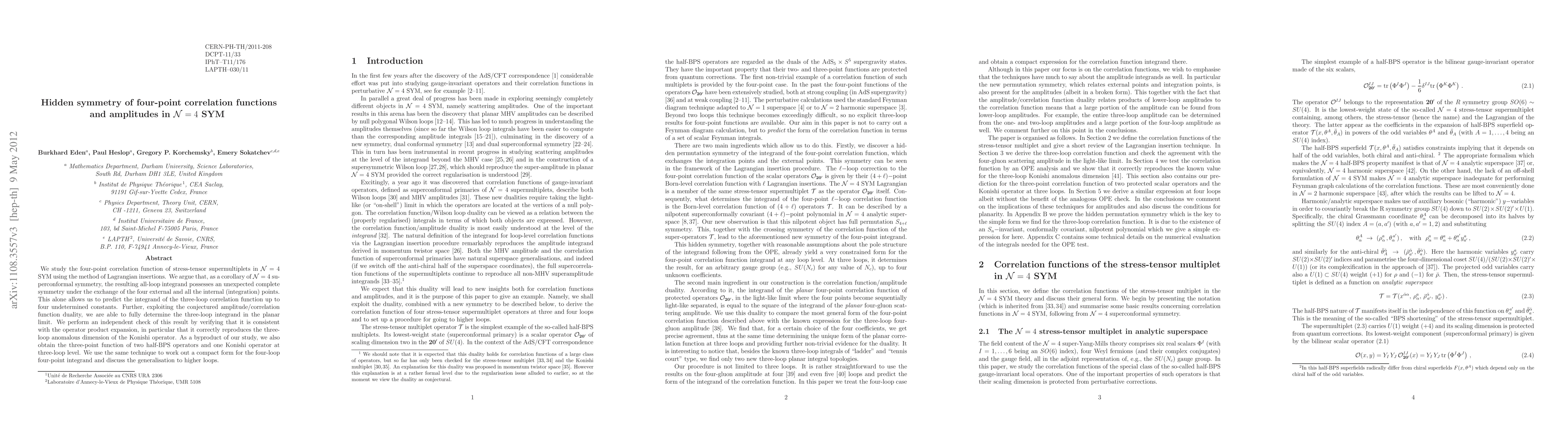We study the four-point correlation function of stress-tensor supermultiplets in N=4 SYM using the method of Lagrangian insertions. We argue that, as a corollary of N=4 superconformal symmetry, the resulting all-loop integrand possesses an unexpected complete symmetry under the exchange of the four external and all the internal (integration) points. This alone allows us to predict the integrand of the three-loop correlation function up to four undetermined constants. Further, exploiting the conjectured amplitude/correlation function duality, we are able to fully determine the three-loop integrand in the planar limit. We perform an independent check of this result by verifying that it is consistent with the operator product expansion, in particular that it correctly reproduces the three-loop anomalous dimension of the Konishi operator. As a byproduct of our study, we also obtain the three-point function of two half-BPS operators and one Konishi operator at three-loop level. We use the same technique to work out a compact form for the four-loop four-point integrand and discuss the generalisation to higher loops.