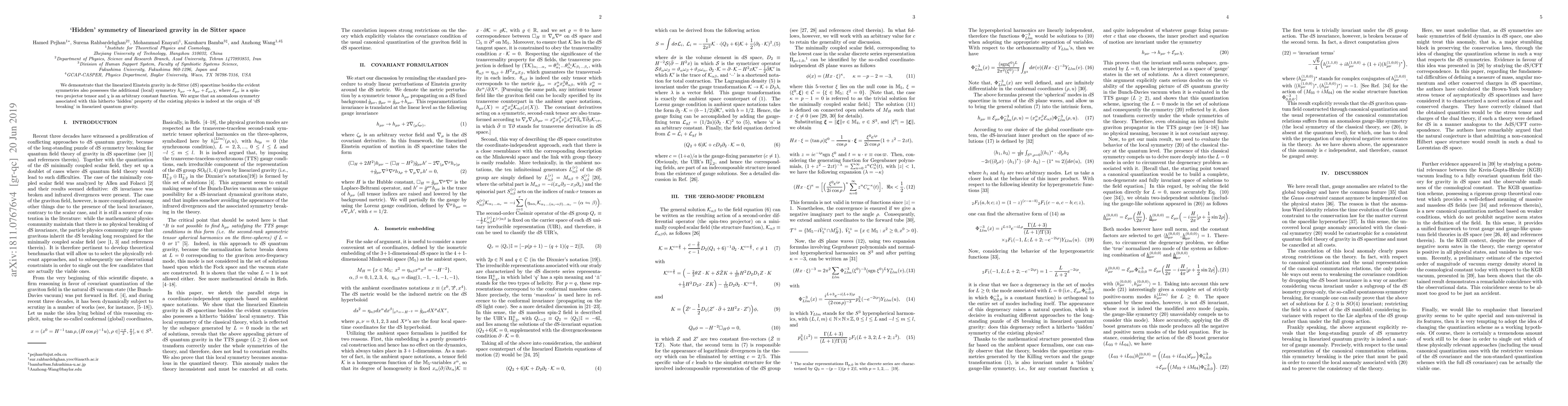 We demonstrate that the linearized Einstein gravity in de Sitter (dS) spacetime besides the evident symmetries also possesses the additional (local) symmetry $h_{\mu\nu}\rightarrow h_{\mu\nu} + {\cal E}_{\mu\nu}\chi$, where ${\cal E}_{\mu\nu}$ is a spin-two projector tensor and $\chi$ is an arbitrary constant function. We argue that an anomalous symmetry associated with this hitherto `hidden' property of the existing physics is indeed at the origin of `dS breaking' in linearized quantum gravity.