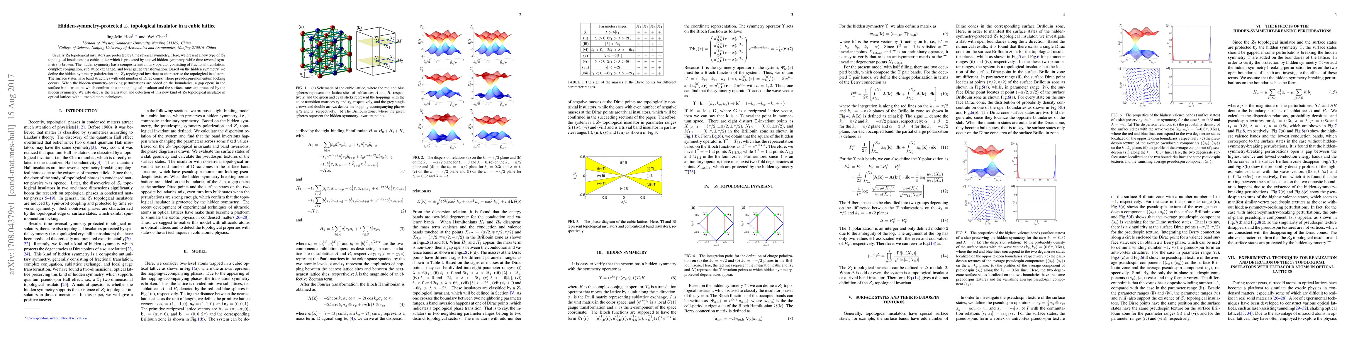 This paper introduces a novel $Z_2$ topological insulator in a cubic lattice protected by a hidden symmetry rather than time reversal symmetry. The hidden symmetry is defined by a composite antiunitary operator and leads to unique surface states with pseudospin-momentum locking and an odd number of Dirac cones.