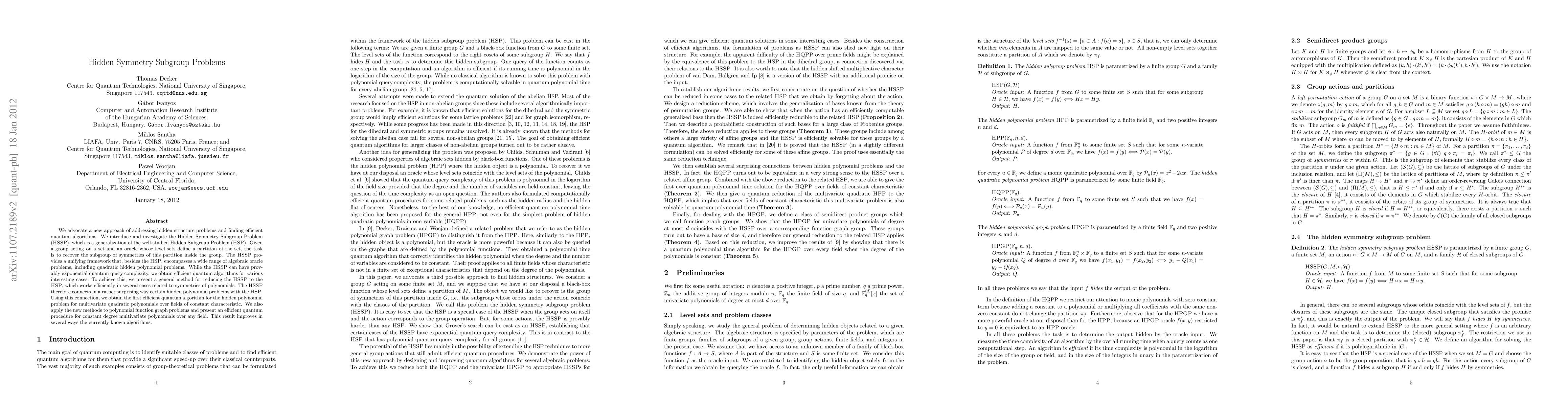 This paper introduces the Hidden Symmetry Subgroup Problem (HSSP), a generalization of the Hidden Subgroup Problem (HSP), and presents efficient quantum algorithms for various cases, including multivariate quadratic polynomials. The authors develop a method to reduce HSSP to HSP, leading to improved quantum procedures for polynomial function graph problems.