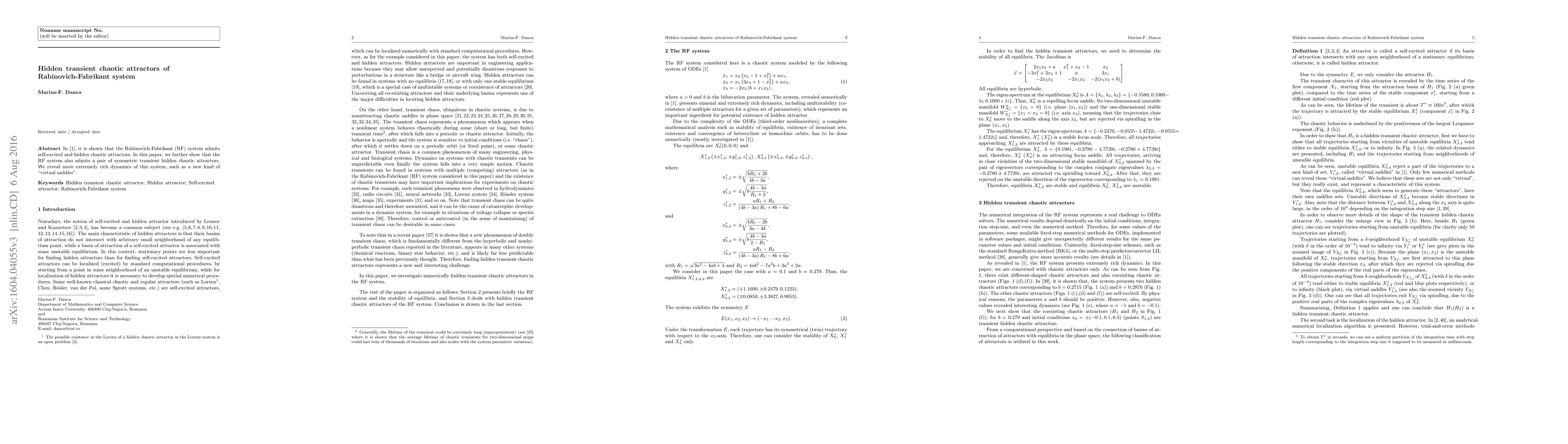 This paper investigates the Rabinovich-Fabrikant system, revealing the existence of a pair of symmetric transient hidden chaotic attractors alongside self-excited and hidden chaotic attractors. It also uncovers new dynamics, including "virtual saddles."