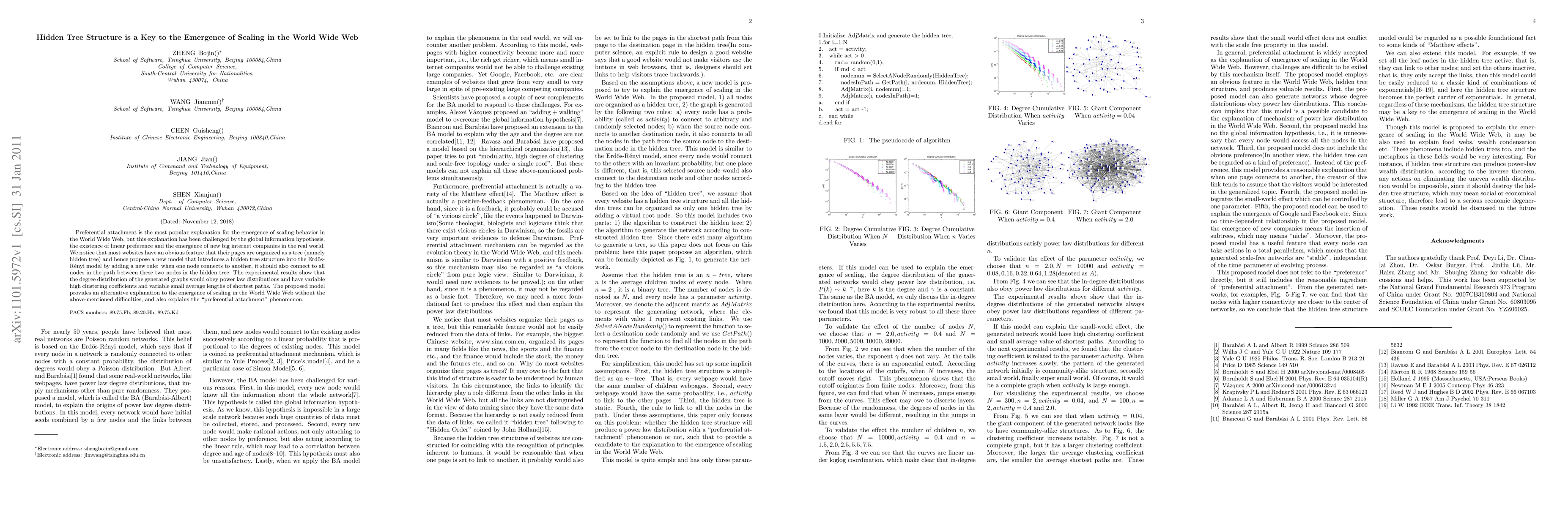 This paper proposes a new model incorporating hidden tree structures into the Erdős-Rényi model to explain the emergence of scaling behavior in the World Wide Web, offering an alternative to preferential attachment explanations. The model's generated graphs exhibit power law degree distributions, high clustering coefficients, and short average path lengths, addressing challenges posed by the global information hypothesis and linear preference.