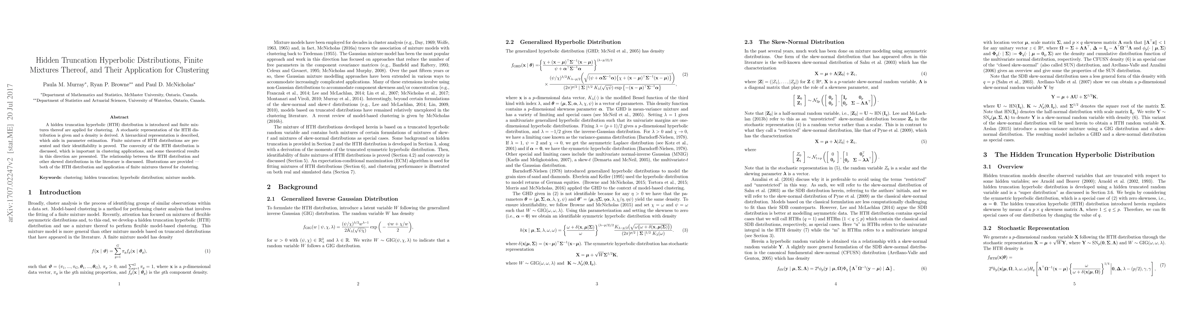 This paper introduces hidden truncation hyperbolic (HTH) distributions and their finite mixtures for clustering. It provides a stochastic representation, derives a density, and discusses the convexity important for clustering applications, proving identifiability of the mixtures.