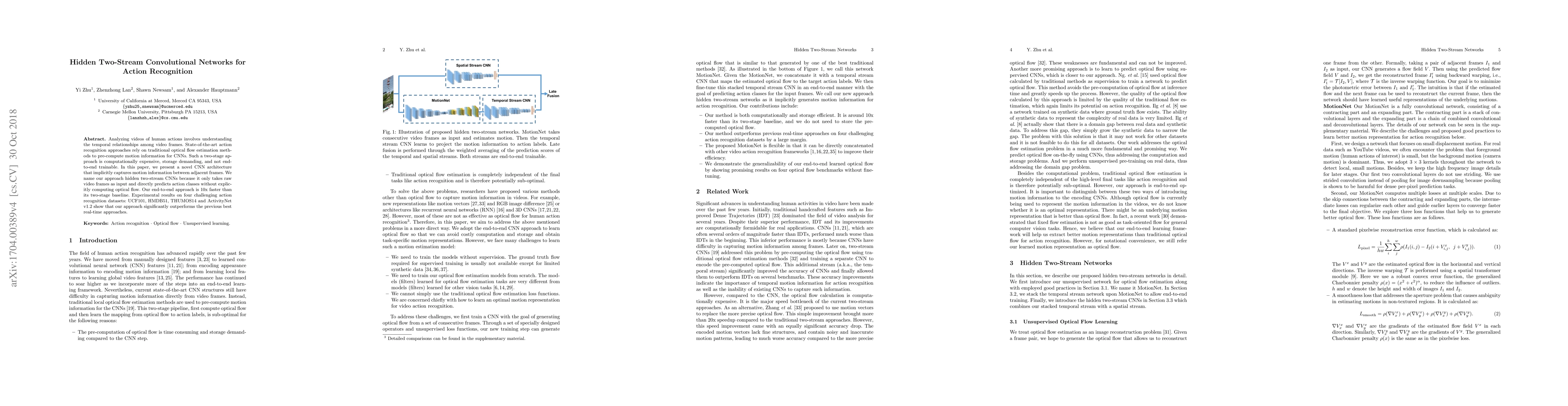 This paper introduces a novel hidden two-stream CNN architecture for action recognition that implicitly captures motion information directly from raw video frames, eliminating the need for optical flow computation. The end-to-end model is 10x faster than traditional two-stage methods and outperforms previous real-time approaches on four datasets.