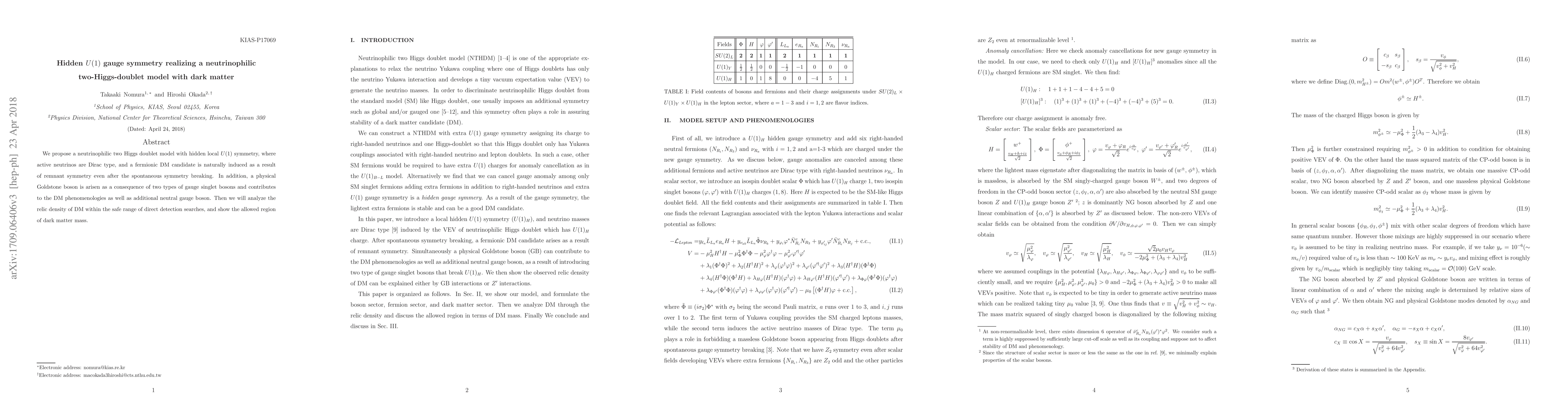 This paper proposes a neutrinophilic two-Higgs-doublet model with a hidden local $U(1)$ symmetry, where active neutrinos are Dirac type and a fermionic dark matter candidate is naturally induced. The model also includes a physical Goldstone boson contributing to dark matter phenomenology and analyzes the relic density within acceptable direct detection limits.