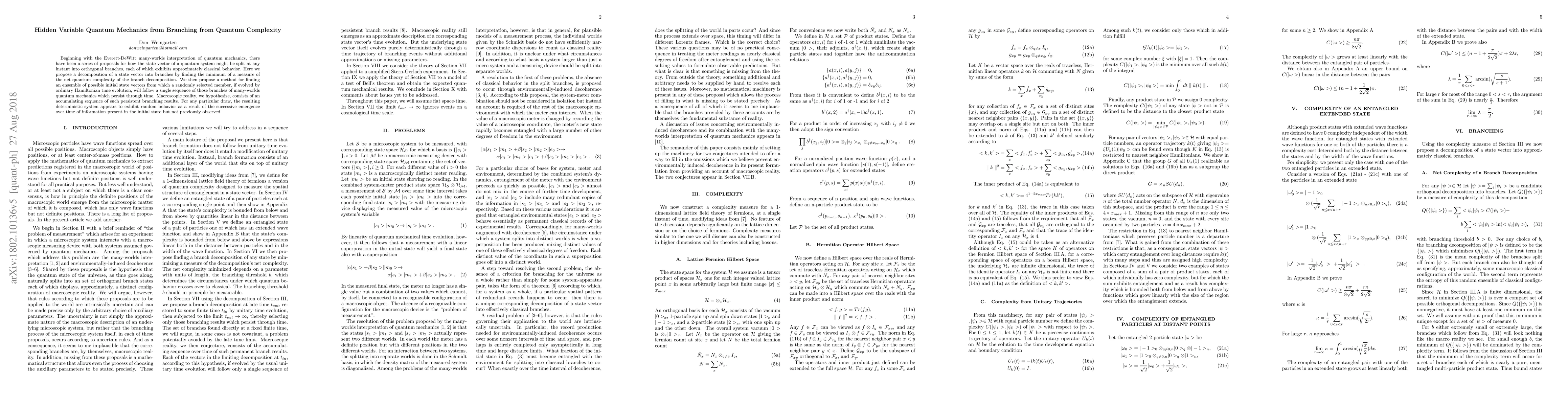 Beginning with the Everett-DeWitt many-worlds interpretation of quantum mechanics, there have been a series of proposals for how the state vector of a quantum system might be split at any instant into orthogonal branches, each of which exhibits approximately classical behavior. Here we propose a decomposition of a state vector into branches by finding the minimum of a measure of the net quantum complexity of the branch decomposition. We then propose a method for finding an ensemble of possible initial state vectors from which a randomly selected member, if evolved by ordinary Hamiltonian time evolution, will follow a single sequence of those branches of many-worlds quantum mechanics which persist through time. Macroscopic reality, we hypothesize, consists of an accumulating sequence of such persistent branching results. For any particular draw, the resulting deterministic system appears to exhibit random behavior as a result of the successive emergence over time of information present in the initial state but not previously observed.