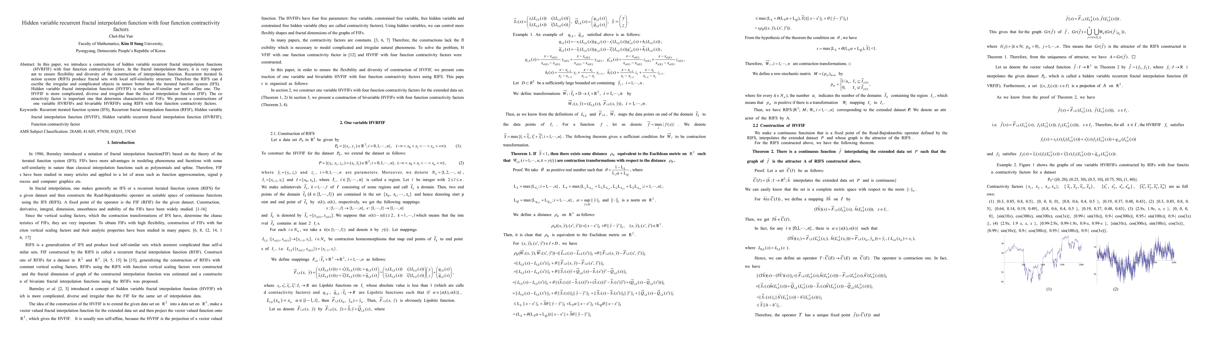 This paper constructs hidden variable recurrent fractal interpolation functions (HVRFIF) using recurrent iterated function systems (RIFS) with four contractivity factors to enhance flexibility and diversity in fractal interpolation. The proposed HVRFIFs are more complex and irregular than traditional fractal interpolation functions, better describing irregular natural objects.