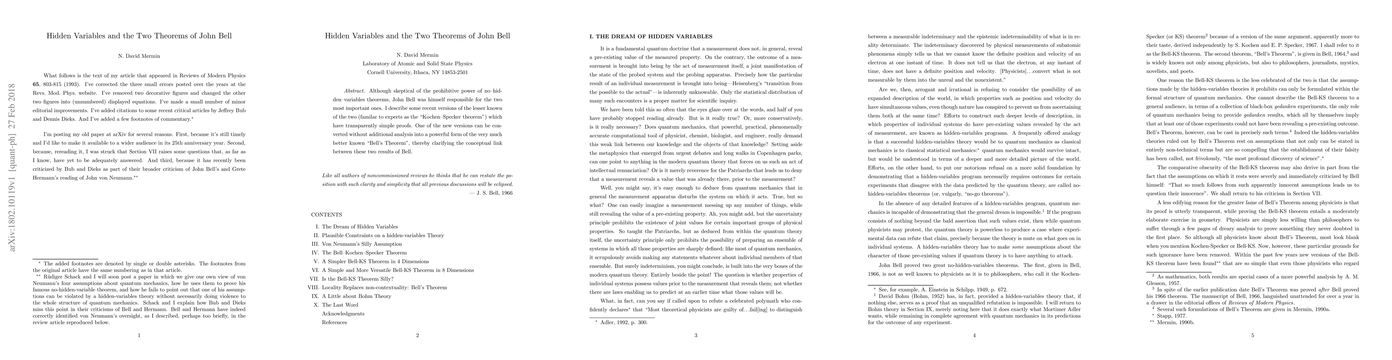 Although skeptical of the prohibitive power of no-hidden-variables theorems, John Bell was himself responsible for the two most important ones. I describe some recent versions of the lesser known of the two (familar to experts as the "Kochen-Specker theorem") which have transparently simple proofs. One of the new versions can be converted without additional analysis into a powerful form of the very much better known "Bell's Theorem", thereby clarifying the conceptual link between these two results of Bell.