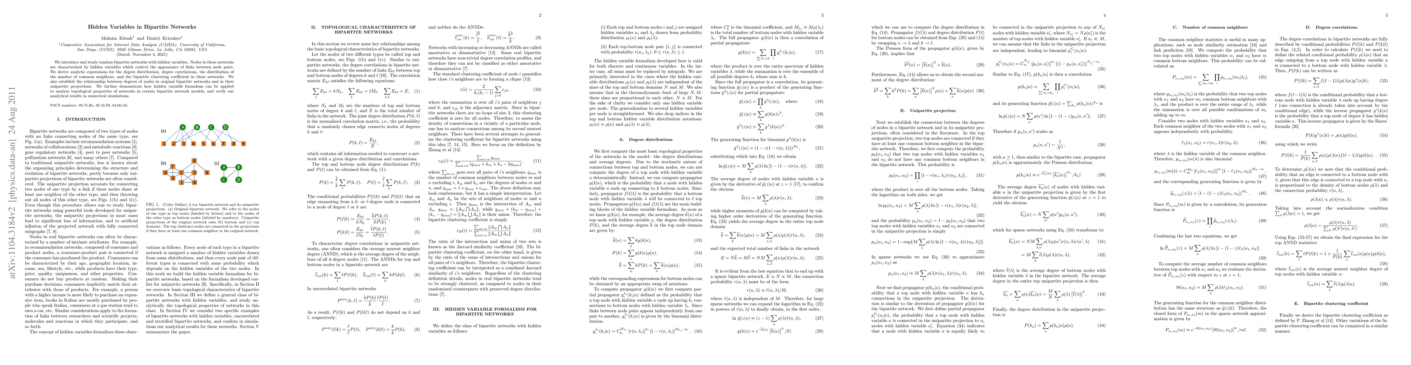 This paper investigates random bipartite networks with hidden variables, deriving expressions for degree distribution, correlations, and clustering coefficients. It also explores the relationship between original bipartite and unipartite network degrees, and validates the analytical findings through numerical simulations.