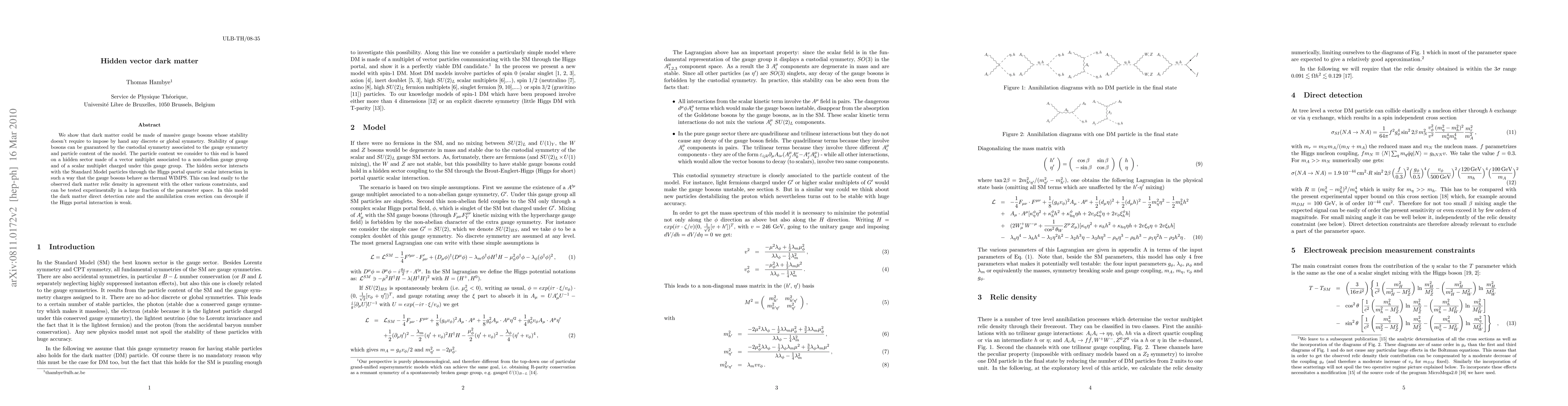 We show that dark matter could be made of massive gauge bosons whose stability doesn't require to impose by hand any discrete or global symmetry. Stability of gauge bosons can be guaranteed by the custodial symmetry associated to the gauge symmetry and particle content of the model. The particle content we consider to this end is based on a hidden sector made of a vector multiplet associated to a non-abelian gauge group and of a scalar multiplet charged under this gauge group. The hidden sector interacts with the Standard Model particles through the Higgs portal quartic scalar interaction in such a way that the gauge bosons behave as thermal WIMPS. This can lead easily to the observed dark matter relic density in agreement with the other various constraints, and can be tested experimentally in a large fraction of the parameter space. In this model the dark matter direct detection rate and the annihilation cross section can decouple if the Higgs portal interaction is weak.
