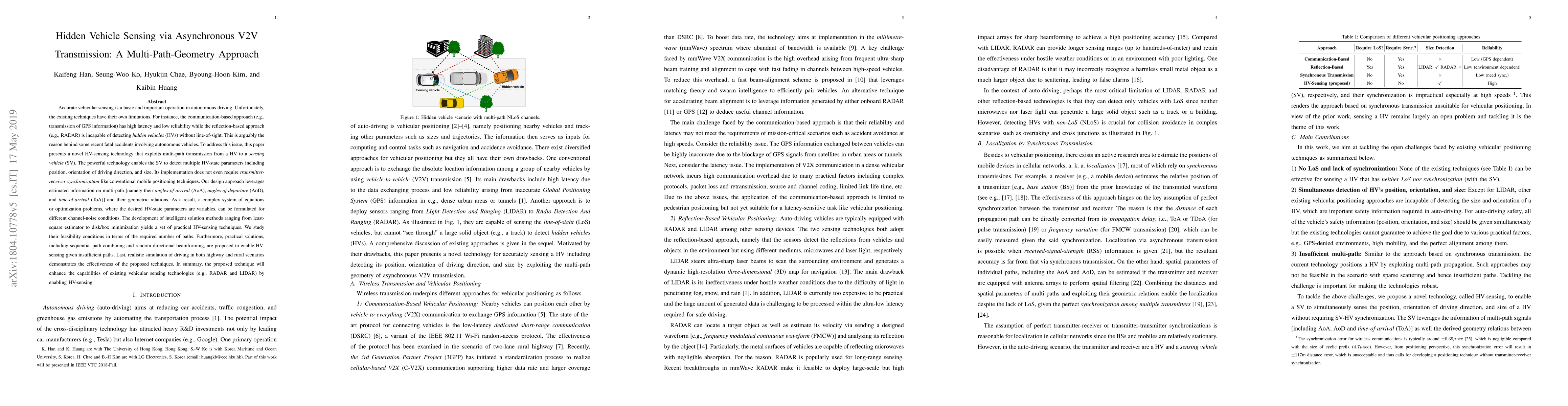 Accurate vehicular sensing is a basic and important operation in autonomous driving. Unfortunately, the existing techniques have their own limitations. For instance, the communication-based approach (e.g., transmission of GPS information) has high latency and low reliability while the reflection-based approach (e.g., RADAR) is incapable of detecting hidden vehicles (HVs) without line-of-sight. This is arguably the reason behind some recent fatal accidents involving autonomous vehicles. To address this issue, this paper presents a novel HV-sensing technology that exploits multi-path transmission from a HV to a sensing vehicle (SV). The powerful technology enables the SV to detect multiple HV-state parameters including position, orientation of driving direction, and size. Its implementation does not even require transmitter-receiver synchronization like conventional mobile positioning techniques. Our design approach leverages estimated information on multi-path (AoA/AoD/ToA) and their geometric relations. As a result, a complex system of equations or optimization problems, where the desired HV-state parameters are variables, can be formulated for different channel-noise conditions. The development of intelligent solution methods ranging from least-square estimator to disk/box minimization yields a set of practical HV-sensing techniques. We study their feasibility conditions in terms of the required number of paths. Furthermore, practical solutions, including sequential path combining and random directional beamforming, are proposed to enable HV-sensing given insufficient paths. Last, realistic simulation of driving in both highway and rural scenarios demonstrates the effectiveness of the proposed techniques. In summary, the proposed technique will enhance the capabilities of existing vehicular sensing technologies by enabling HV-sensing.